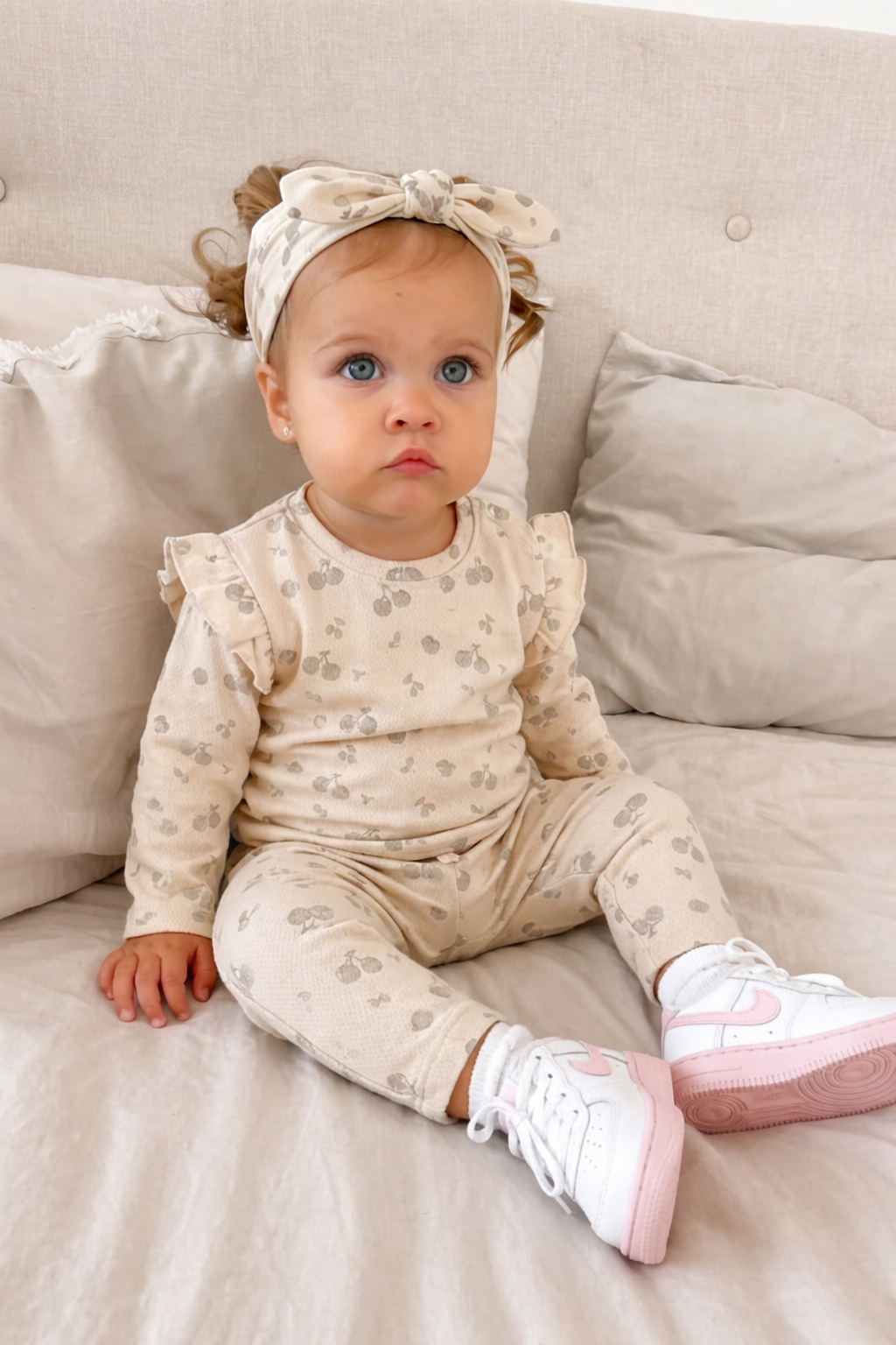 Comfortabel meisjes broekje van Dirkje in crème met print en ruches. Inclusief bijpassende haarband. Verkrijgbaar in maat 74 t/m 116.