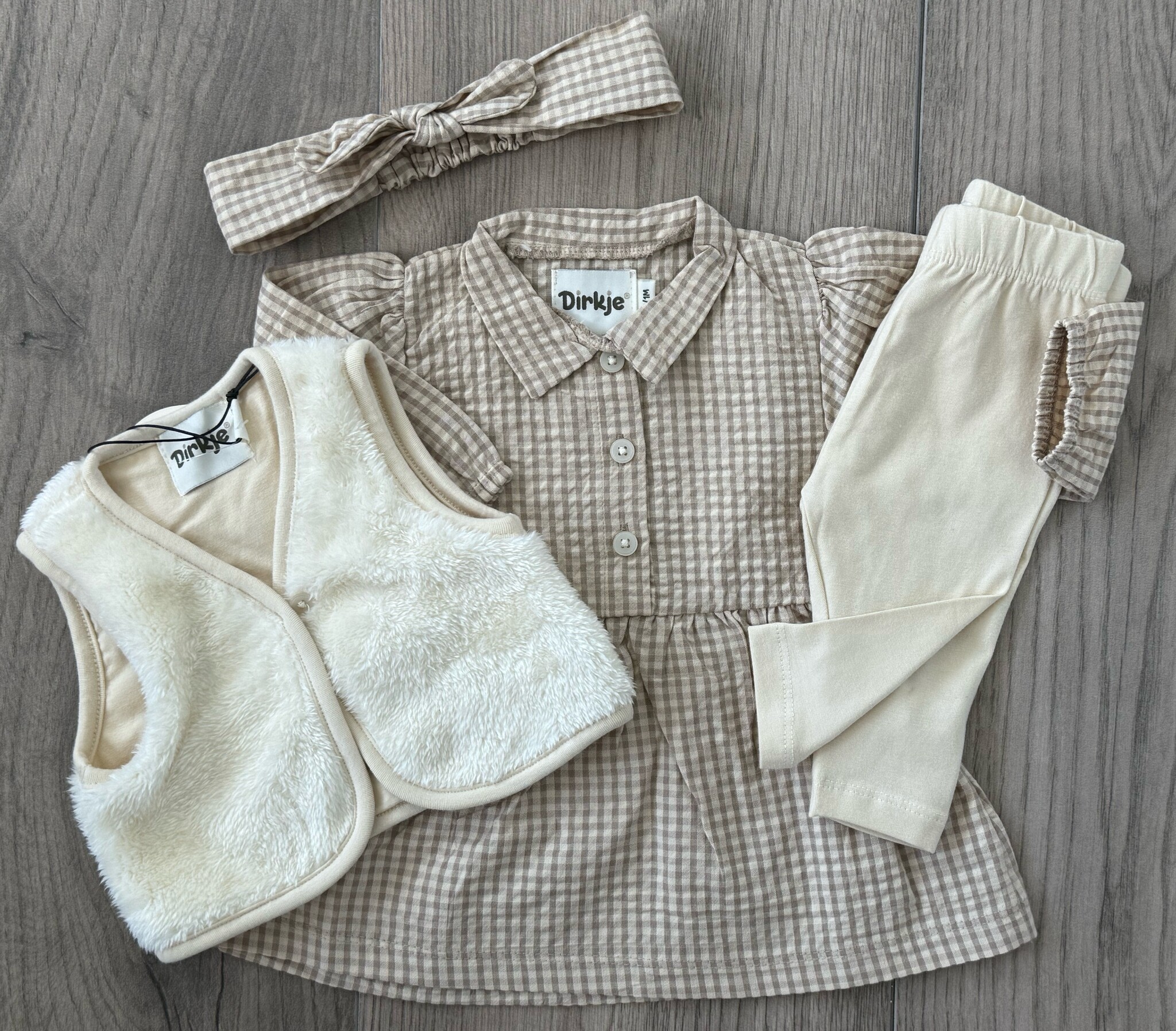 Complete 4-delige babyset van Dirkje met jurkje, legging, zacht bontgilet en haarband. Stijlvol en comfortabel, verkrijgbaar in maat 56 t/m 86.