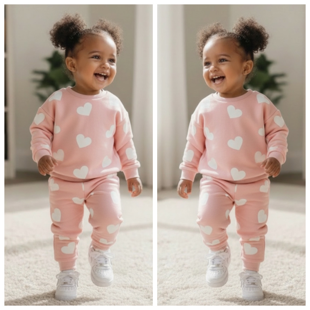 Laat je kleintje stralen in dit 2-delige roze joggingpak met vrolijke witte hartjes. De set bestaat uit een zachtesweater met ronde hals en bijpassendejogger met comfortabele elastische tailleband. Het witte design met speelse hartjesprint maakt dit outfit perfect voor Valentijnsdag, maar ook heerlijk voor elke dag. Gemaakt van een soepele katoenmix die zacht aanvoelt op de huid en veel bewegingsvrijheid biedt. Verkrijgbaar van maat 56/62 t/m 98/104