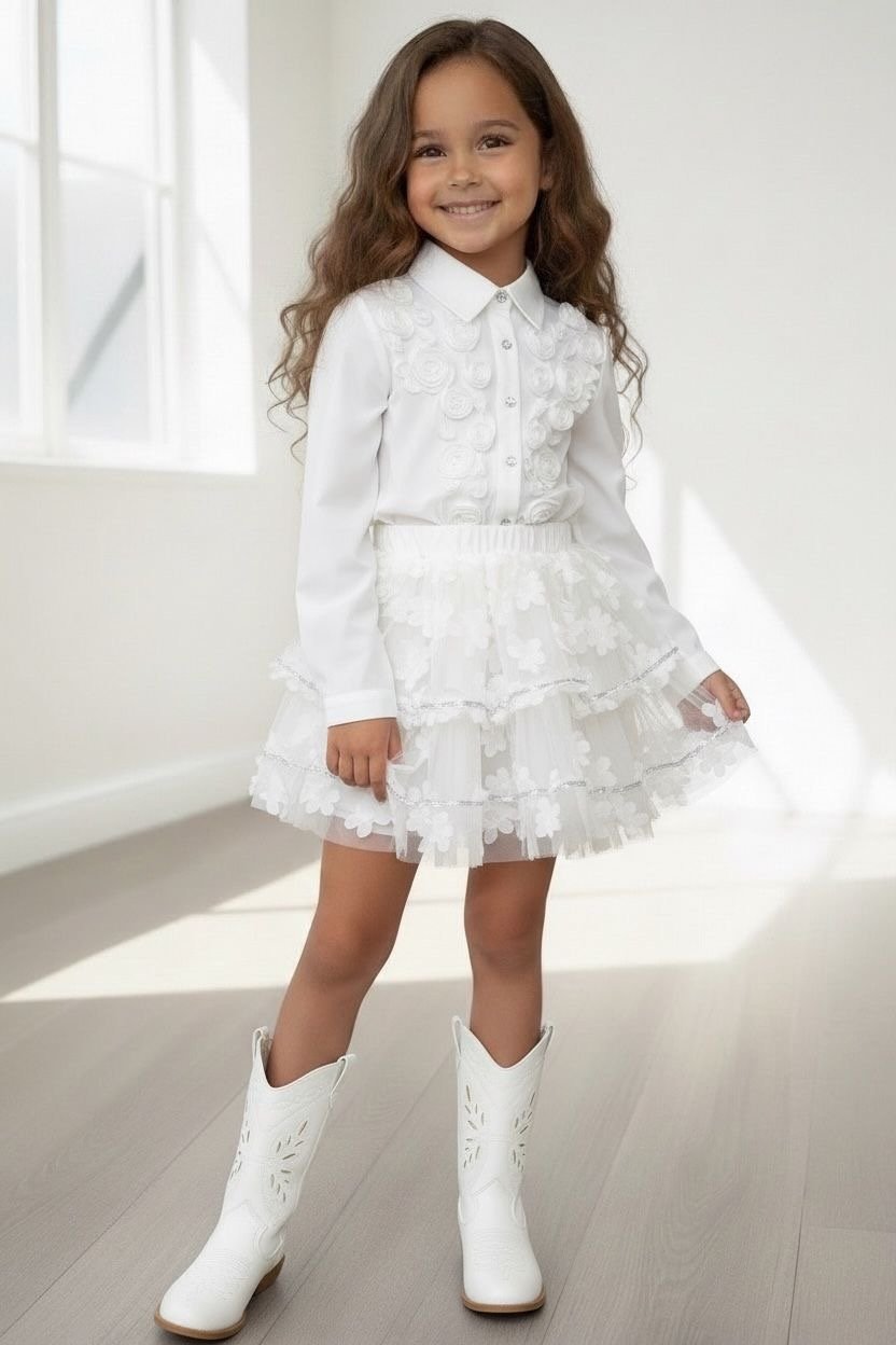Deze stijlvolle 2-delige meisjes set bestaat uit een bloemen tule rok en een bijpassende blouse. De perfecte combinatie van comfortabel en chic, geschikt voor zowel dagelijkse outfits als speciale momenten.
