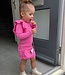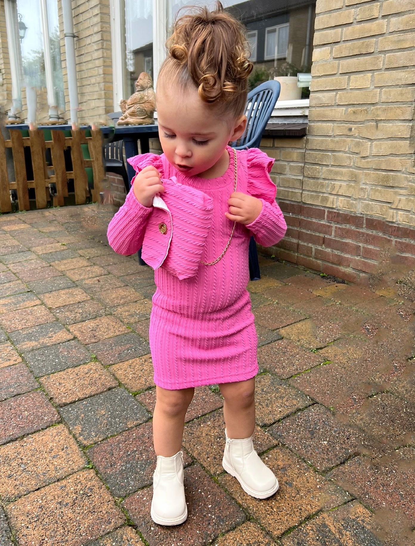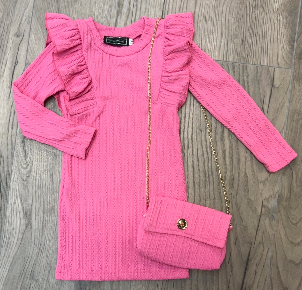 Dit roze gebreide meisjesjurkje met ruffles is een tijdloze klassieker. De ribbrei en subtiele ruffles op de schouders zorgen voor een stijlvolle, lieve look.