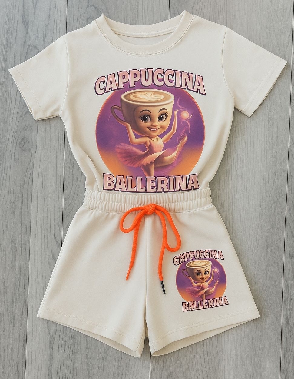 TikTok-trend alert! Dit zomersetje met Ballerina Cappuccina Ballerina is een echte musthave. Zacht shirt en short met opvallende print. Maat 110 t/m 164.