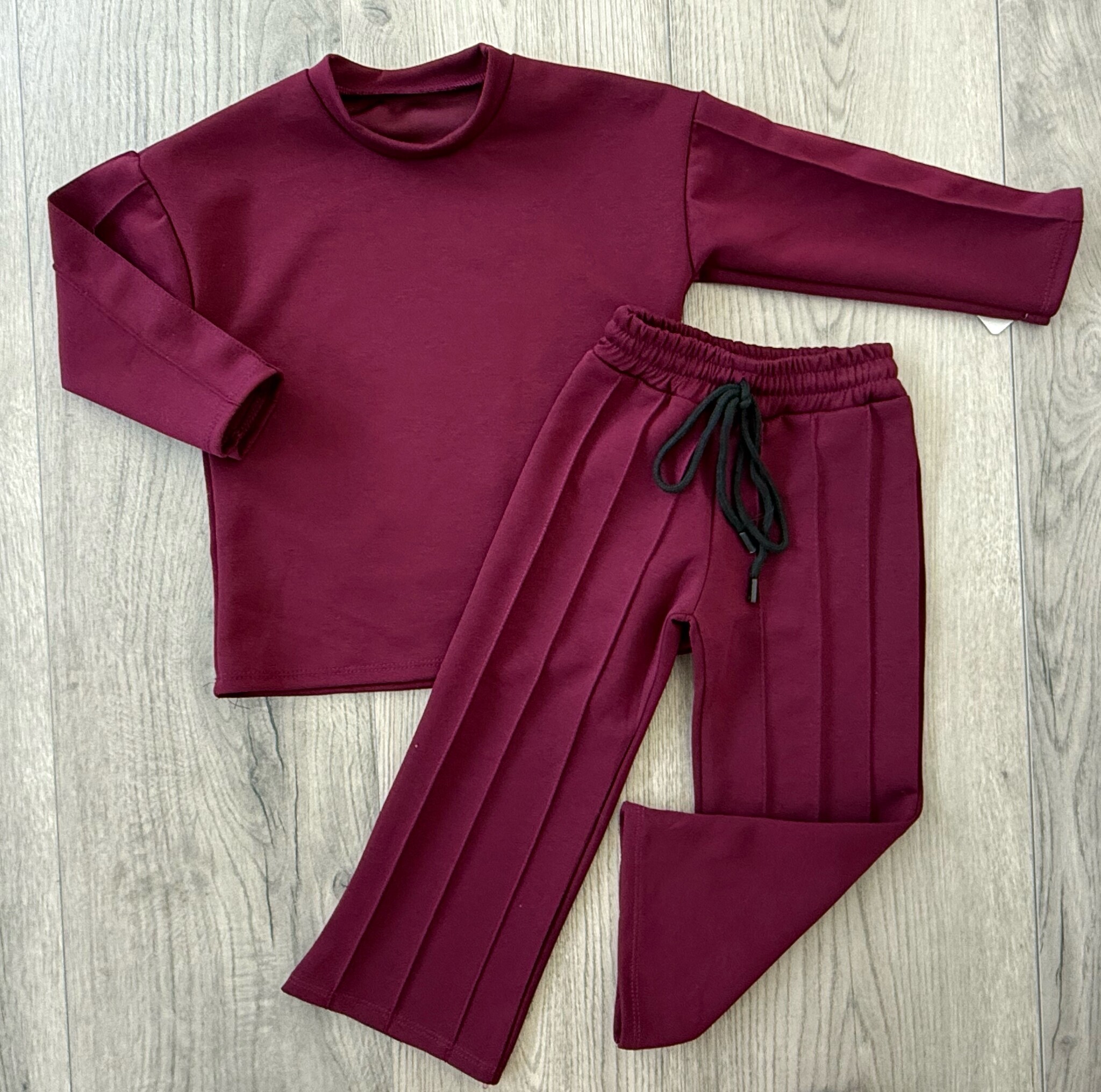 Bordeauxkleurige meisjes set bestaande uit een lange mouwen shirt en een flared broek Comfortabel én trendy! Perfect voor meiden die houden van fashion. Verkrijgbaar van maat 98/104 t/m 158/164.