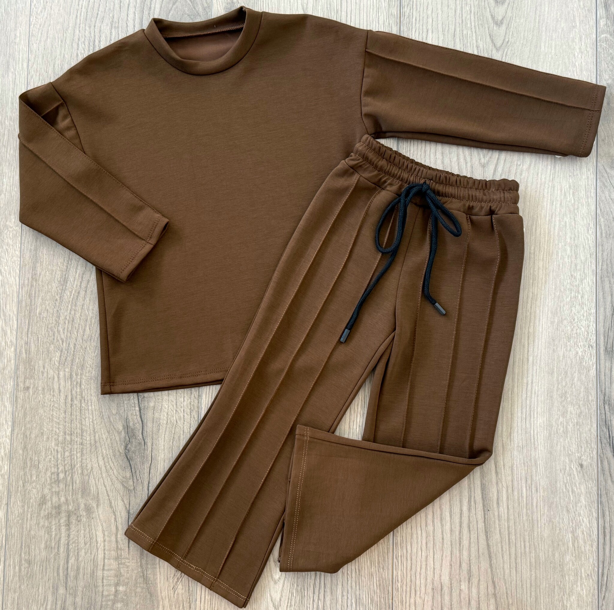 Donker bruine meisjes set bestaande uit een lange mouwen shirt en een flared broek Comfortabel én trendy! Perfect voor meiden die houden van fashion. Verkrijgbaar van maat 98/104 t/m 158/164.