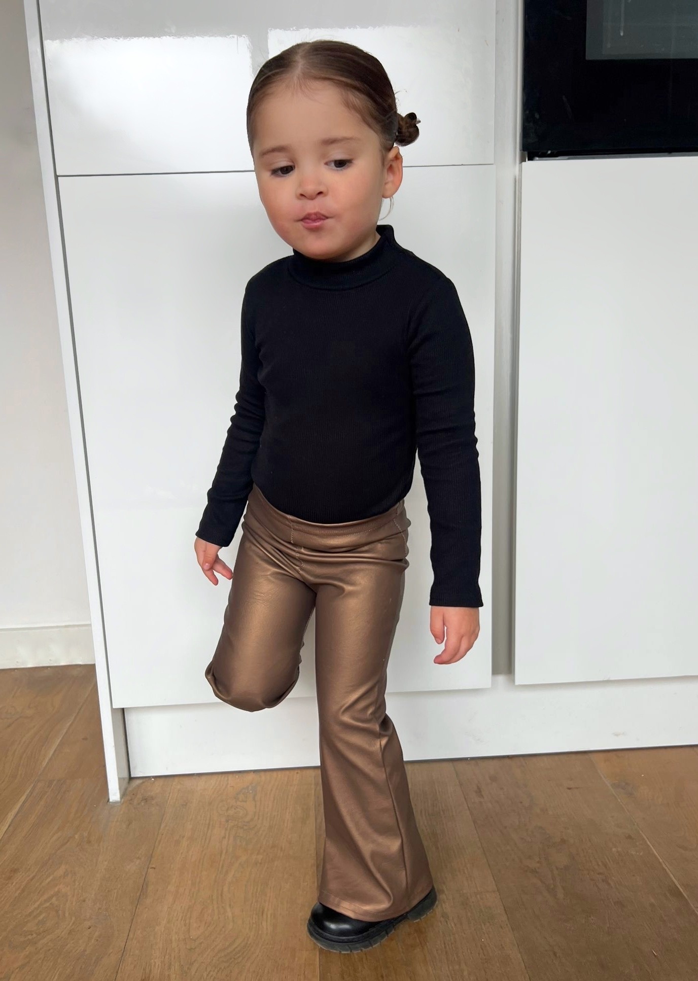 Stoere bronzen leatherlook flared broek voor meisjes. Trendy en comfortabel, ideaal voor feestdagen of alledaags met een blouse of sweater. Maat 80/86 t/m 134/140.