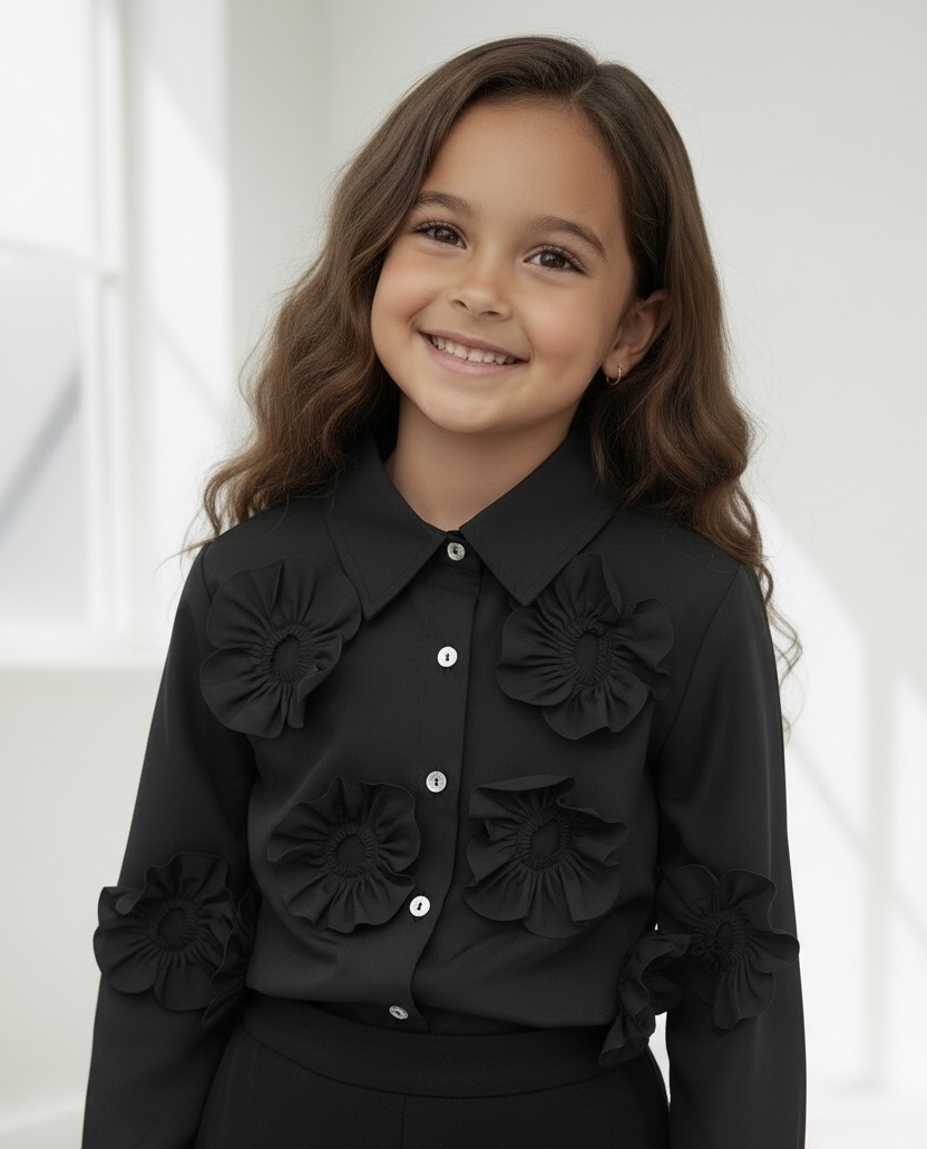 Trendy satijnen blouse in de kleur zwart voor meisjes. Elegant, comfortabel en perfect voor zowel dagelijks als feestelijk gebruik. Makkelijk te combineren met iedere outfit. Verkrijgbaar in maat 98/104 t/m 158/164.