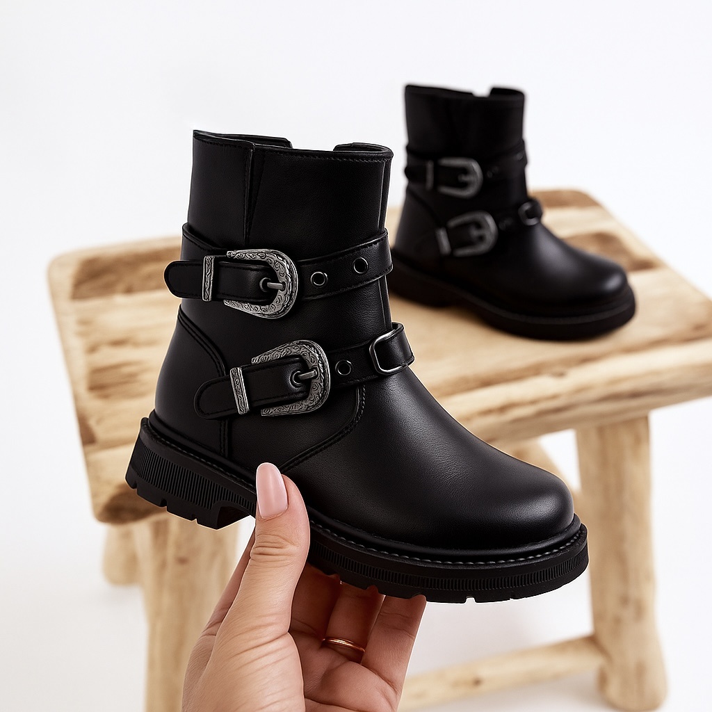 Trendy zwarte enkellaarsjes met zilveren gespen. Stoer én stijlvol! Perfect te combineren met jurkjes of broeken.