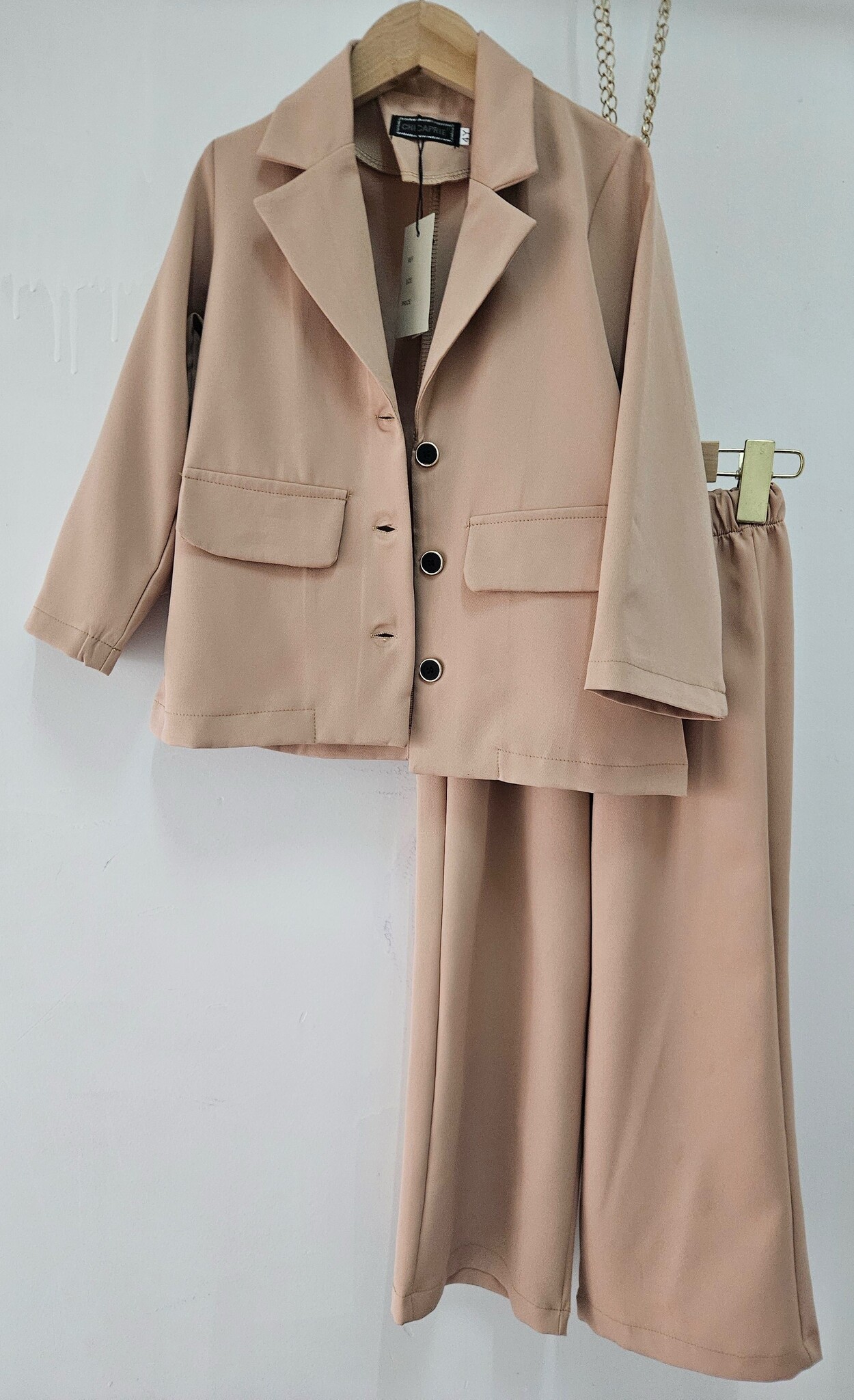 Beige meisjes blazer setje met wijde broekspijp. Gemaakt van neutrale stof voor een comfy fit. Verkrijgbaar van maat 98/104 t/m 158/164.