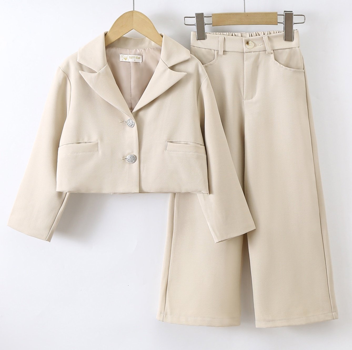 Beige meisjes blazer setje met wijde broekspijp. Gemaakt van neutrale stof voor een comfy fit. Verkrijgbaar van maat 98/104 t/m 158/164.