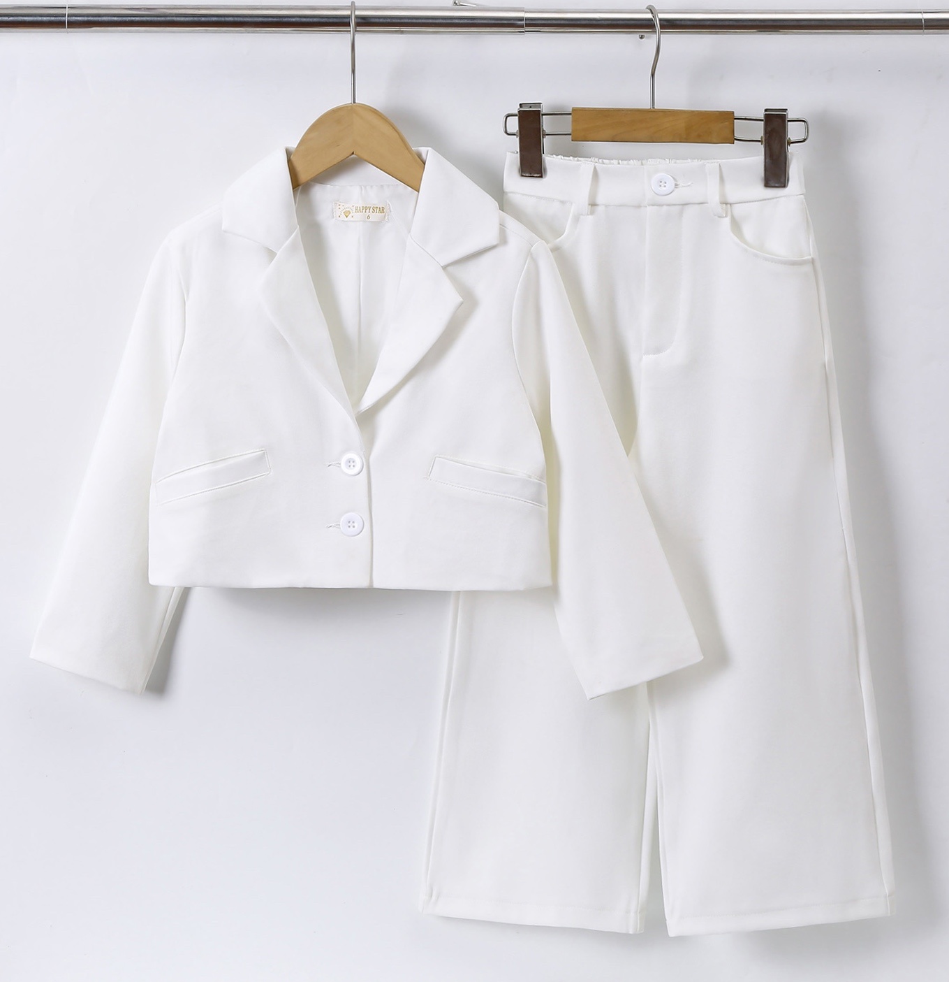 Witte meisjes blazer setje met wijde broekspijp. Gemaakt van neutrale stof voor een comfy fit. Verkrijgbaar van maat 98/104 t/m 158/164.