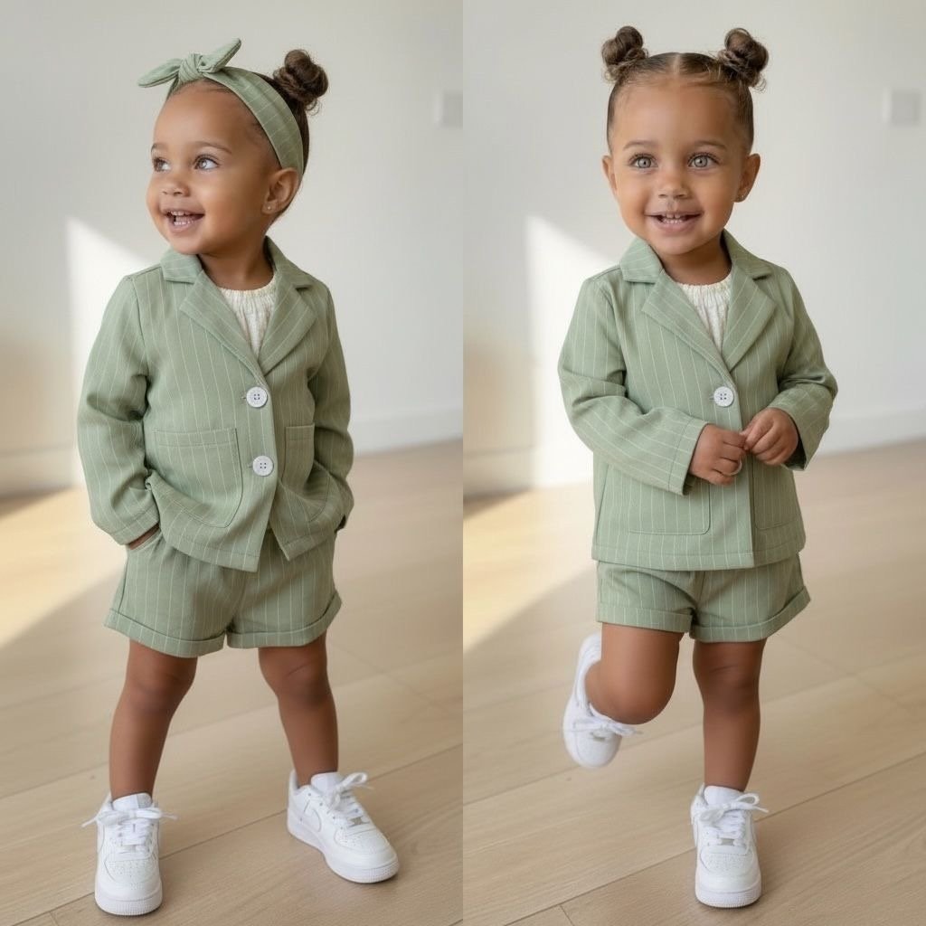 Dit mint blazer setje is een prachtig basic item voor jouw baby of peuter! De 3-delige set bestaat uit een blazer korte broek en een bijpassende haarband met strik. Gemaakt van zachte, comfortabele ribstof die heerlijk draagt en een stijlvolle uitstraling geeft.