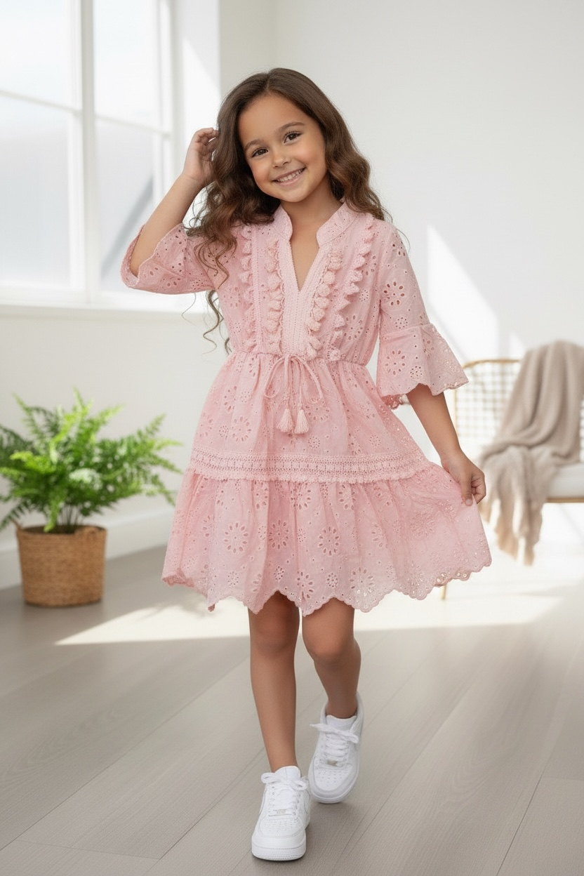 Boho Broderie Jurkje - Roze (Verzenddatum 26 feb)