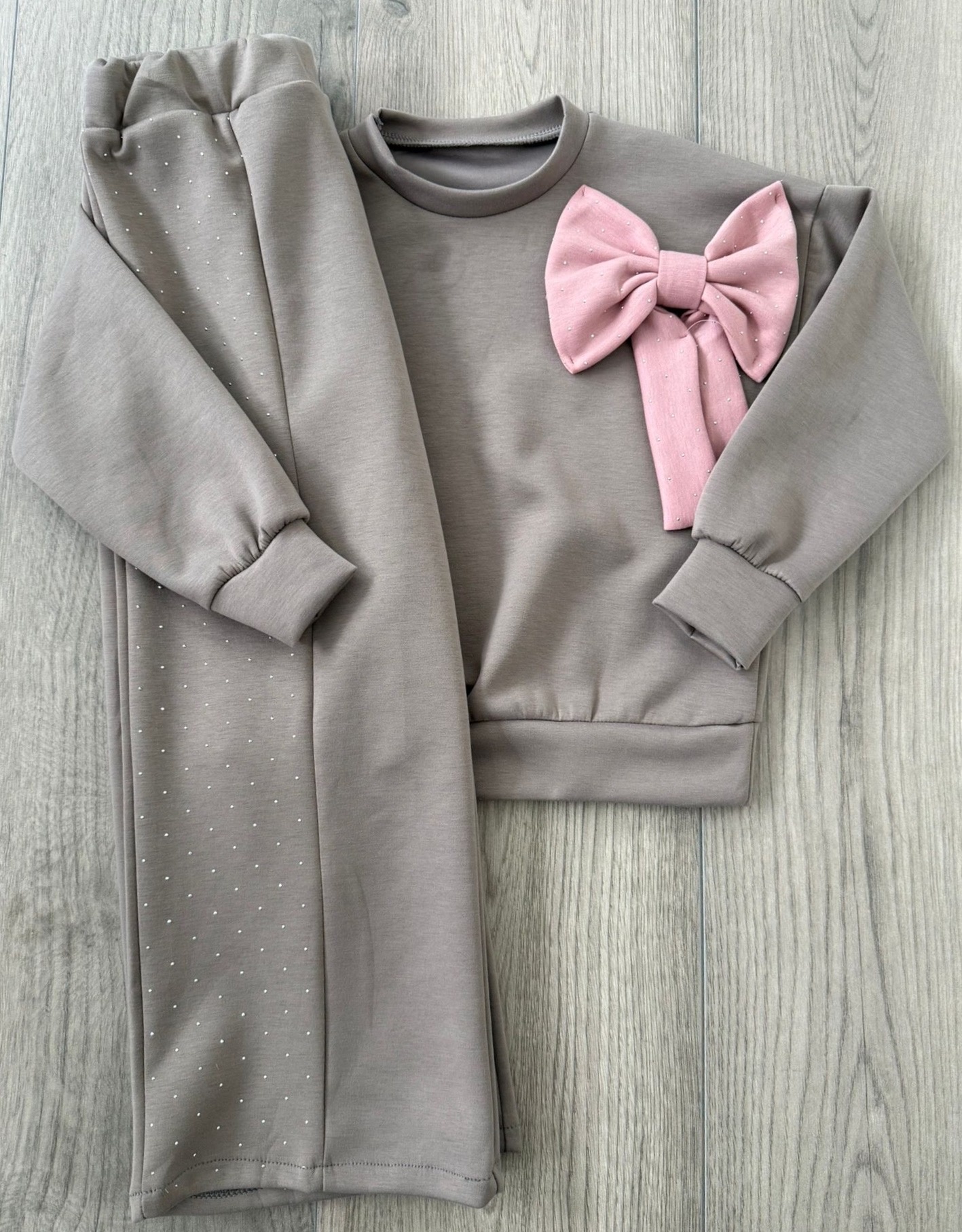 Beige meisjes set met een grote strik op de trui en sparkles op de flared. Gemaakt van stretchstof voor een comfy fit. Verkrijgbaar van maat 98/104 t/m 158/164. Super trendy én lief!