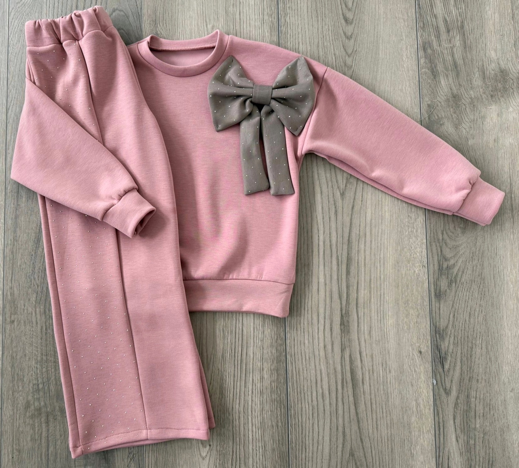 Roze meisjes setje met een grote strik op de trui en sparkles op de flared. Gemaakt van stretchstof voor een comfy fit. Verkrijgbaar van maat 98/104 t/m 158/164. Super trendy én lief!