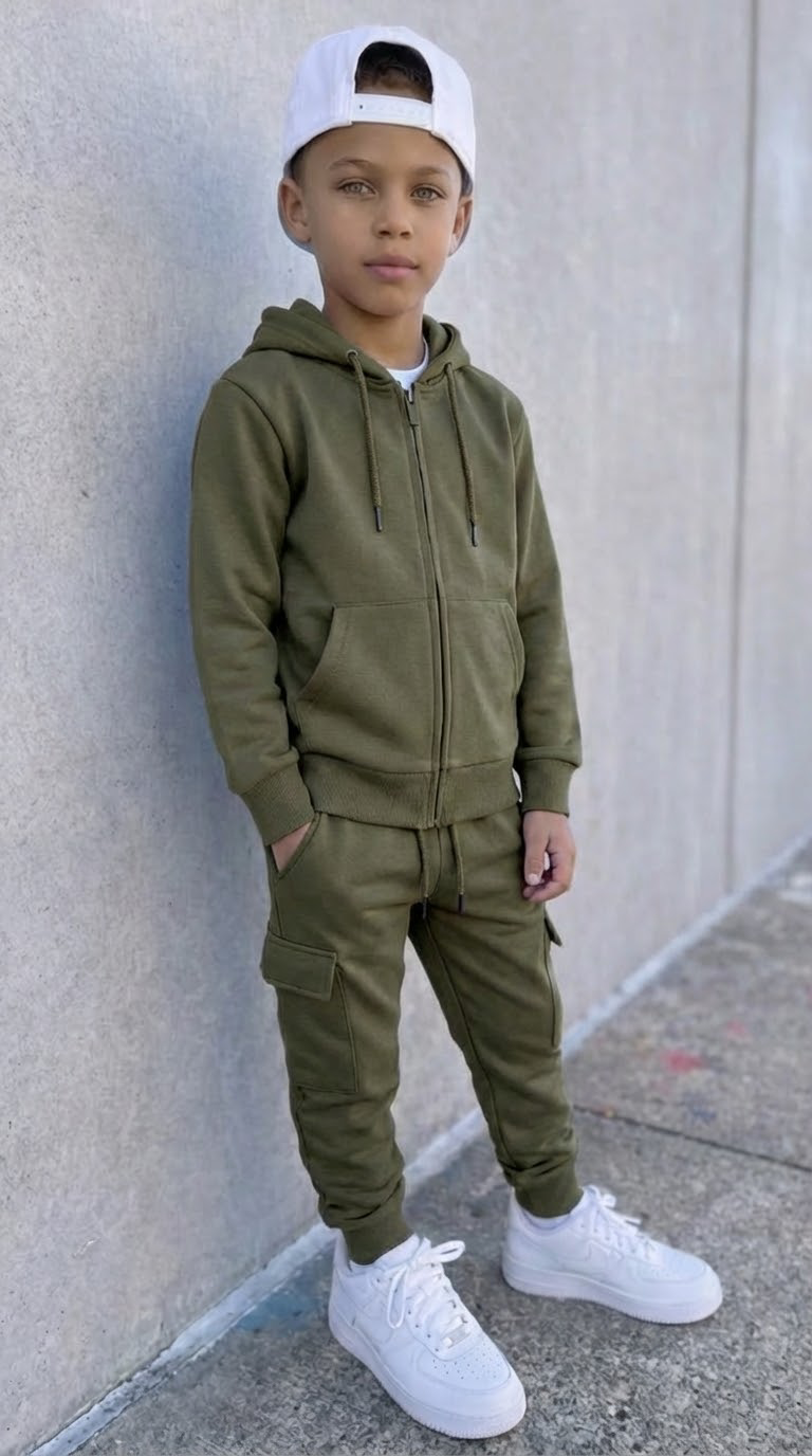 Deze stoere olijfgroene joggingset is perfect voor kids die houden van comfort én een streetstyle look. De set bestaat uit een hoodie met rits en capuchon, gecombineerd met een bijpassende cargo joggingsbroek met zakken op de benen. De cargo details geven de set een trendy en sportieve uitstraling.