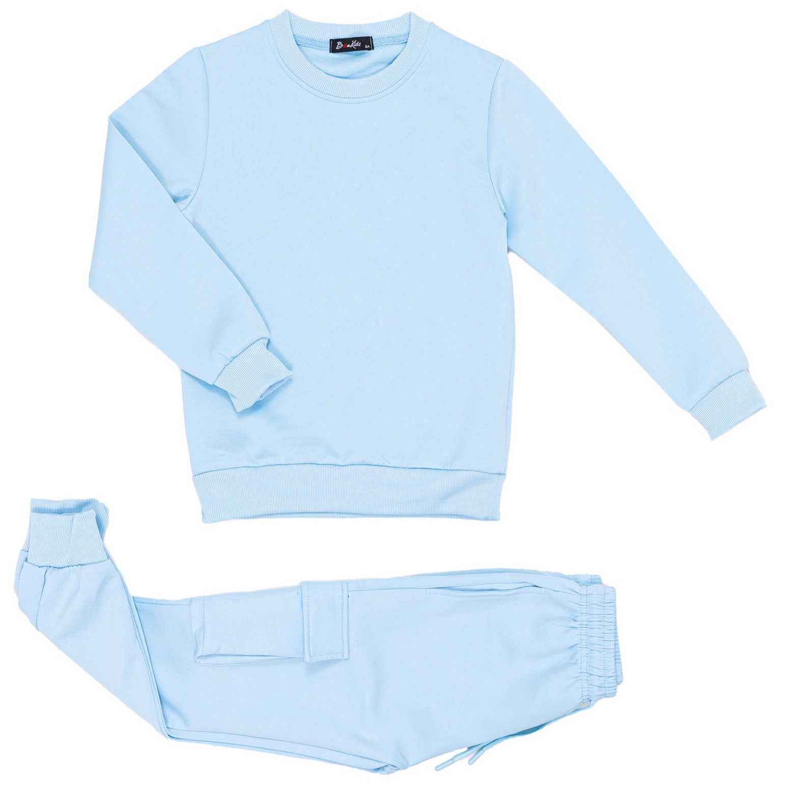 Comfortabele lichtblauwe joggingset voor kinderen. Zacht, trendy en ideaal voor elke dag. Verkrijgbaar in maat 104/110 t/m 158/164.