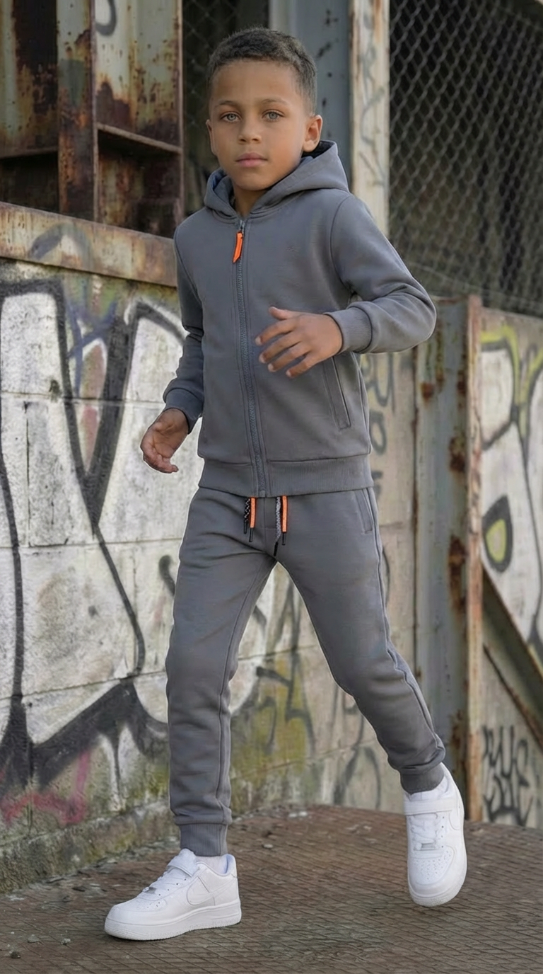 Comfortabele grijze joggingset voor kinderen met hoodie en broek. Zacht, sportief en ideaal voor elke dag. Verkrijgbaar in maat 104/110 t/m 158/164.