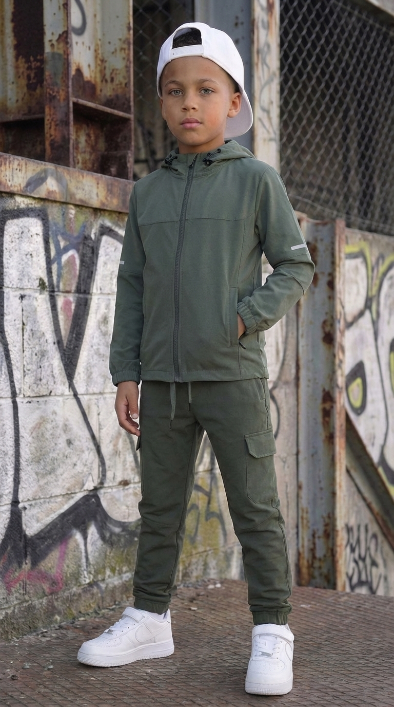 Deze stijlvolle Khaki joggingset is een echte musthave voor actieve kids. De set bestaat uit een vest met rits en capuchon, gecombineerd met een bijpassende broek met elastische tailleband en boorden aan de enkels. De neutrale taupe kleur zorgt voor een rustige, trendy uitstraling en is makkelijk te combineren.