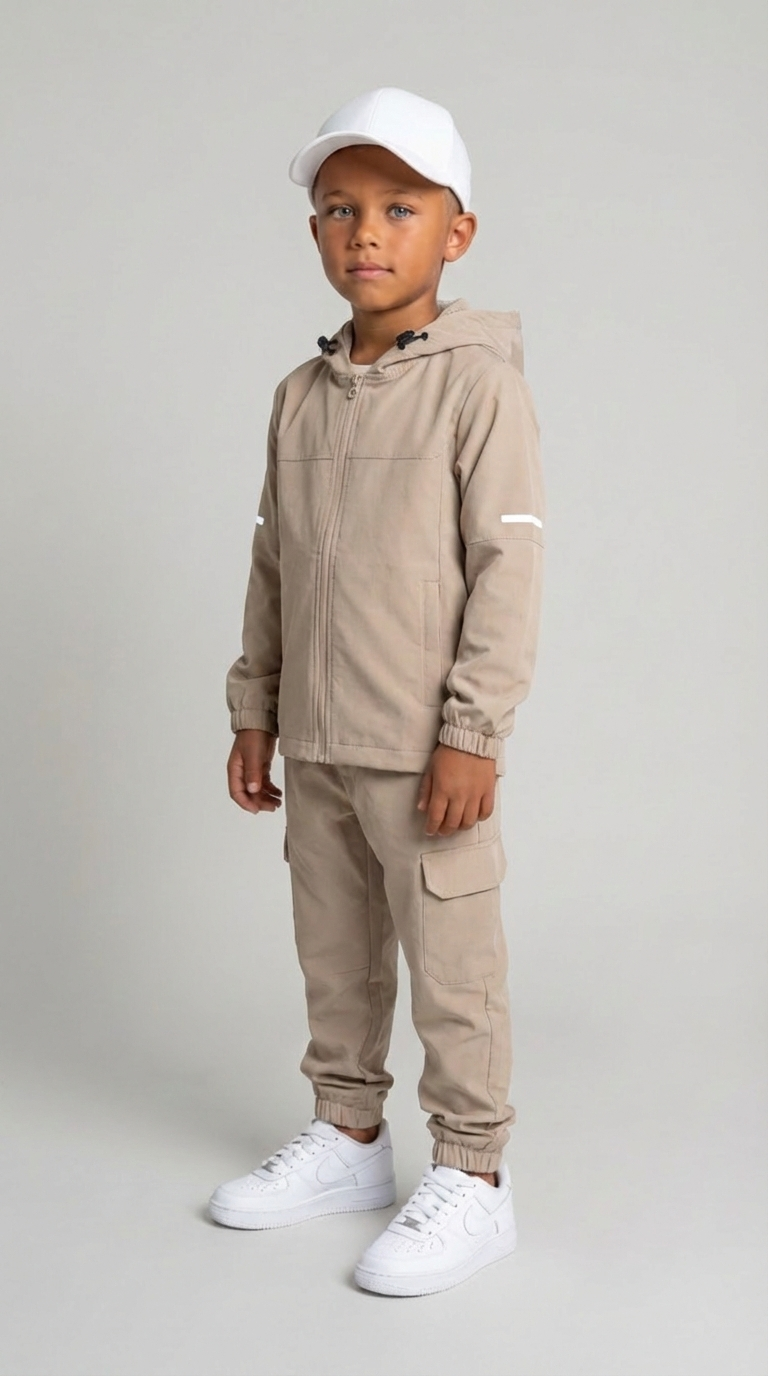 Deze stijlvolle taupe joggingset is een echte musthave voor actieve kids. De set bestaat uit een vest met rits en capuchon, gecombineerd met een bijpassende broek met elastische tailleband en boorden aan de enkels. De neutrale taupe kleur zorgt voor een rustige, trendy uitstraling en is makkelijk te combineren.
