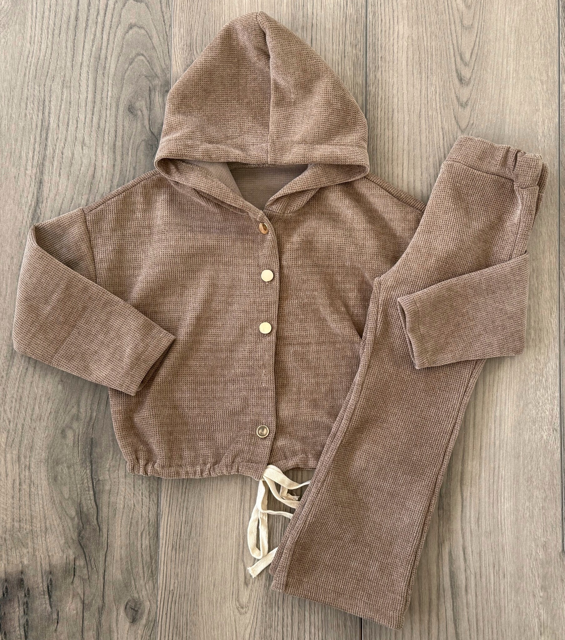 Dit zachte meisjes setje is een echte musthave voor dit seizoen. Het 2-delige pakje bestaat uit een comfortabele hoodie met knopen en een bijpassende broek in een warme bruine kleur. Gemaakt van een heerlijk zachte stof die niet alleen fijn aanvoelt, maar ook zorgt voor een stijlvolle uitstraling.