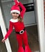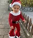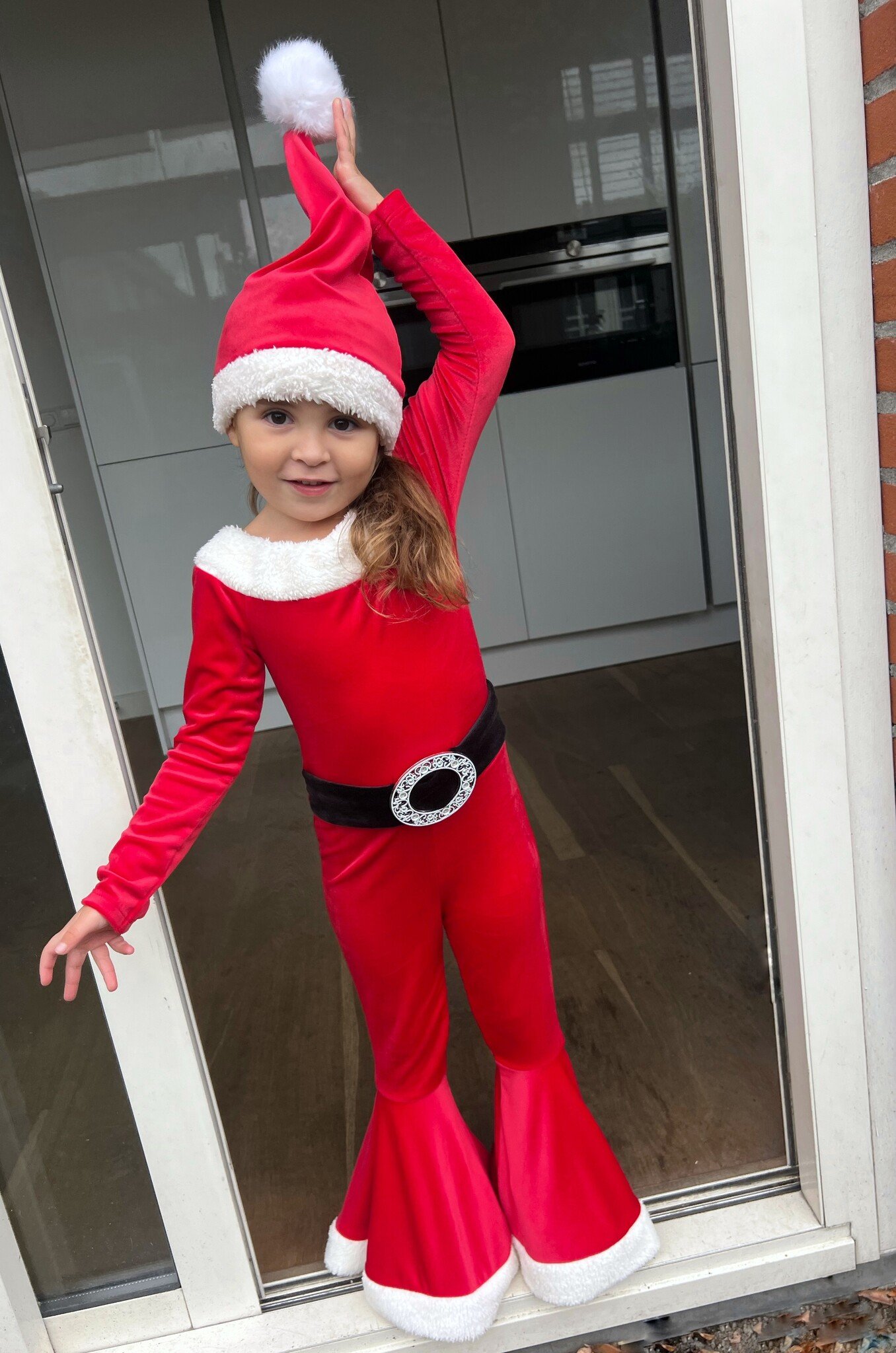 Feestelijk rood kerst jumpsuit van fluweel met witte bontdetails en bijpassende kerstmuts. Perfect voor de feestdagen!