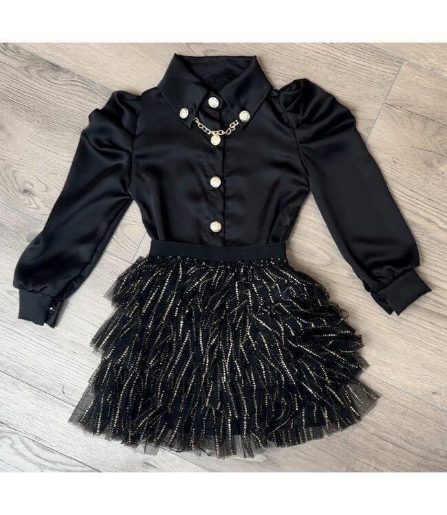 Chique zwarte blouse met gouden knopen en kettingdetail. Perfect voor feestjes, verjaardagen of de feestdagen!