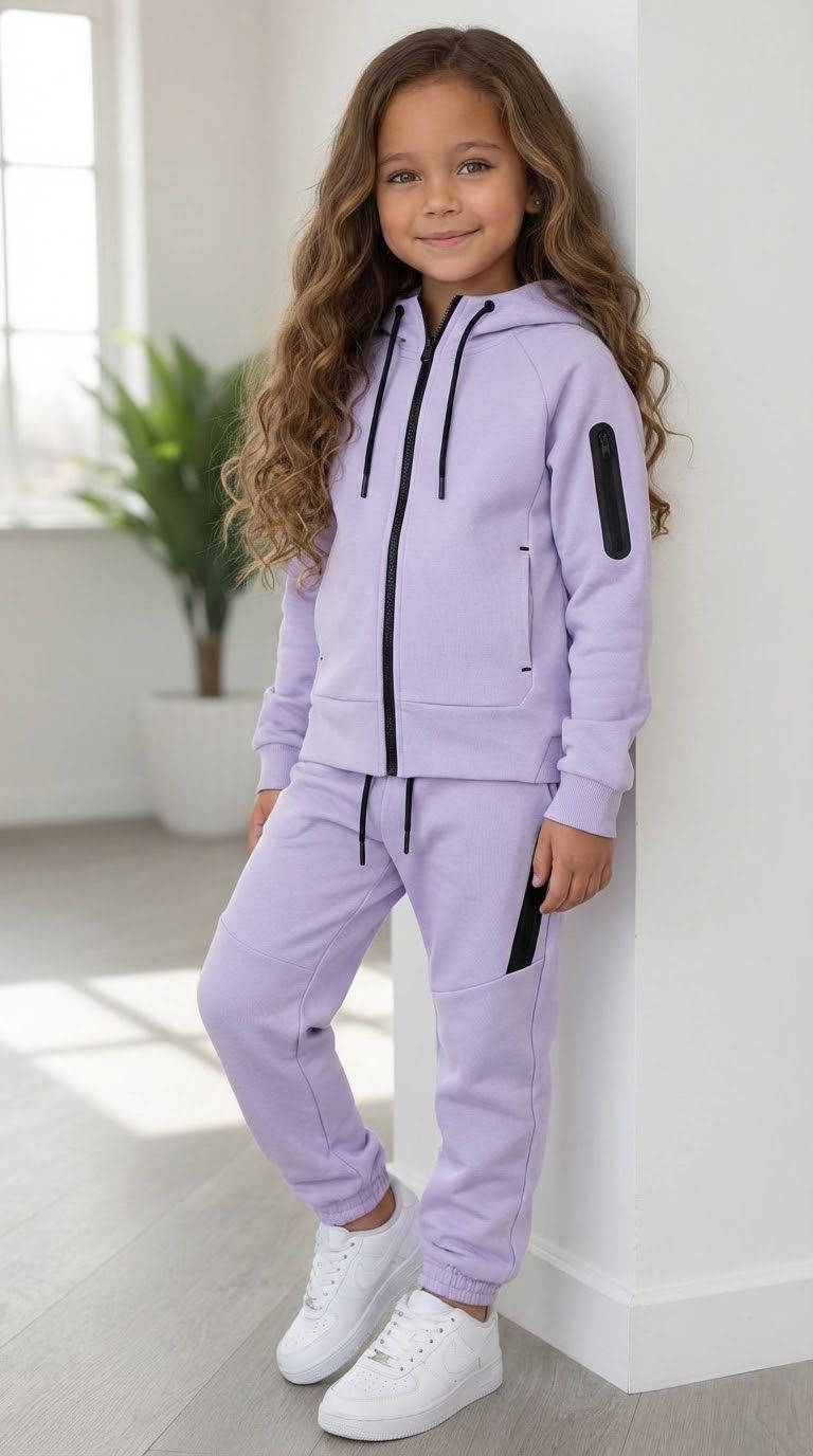 Dit trendy lila trainingspak is perfect voor meisjes die houden van comfort en een sportieve, modieuze look. De set bestaat uit een hoodie met ritssluiting en capuchon en een bijpassende joggingbroek met stoere details.