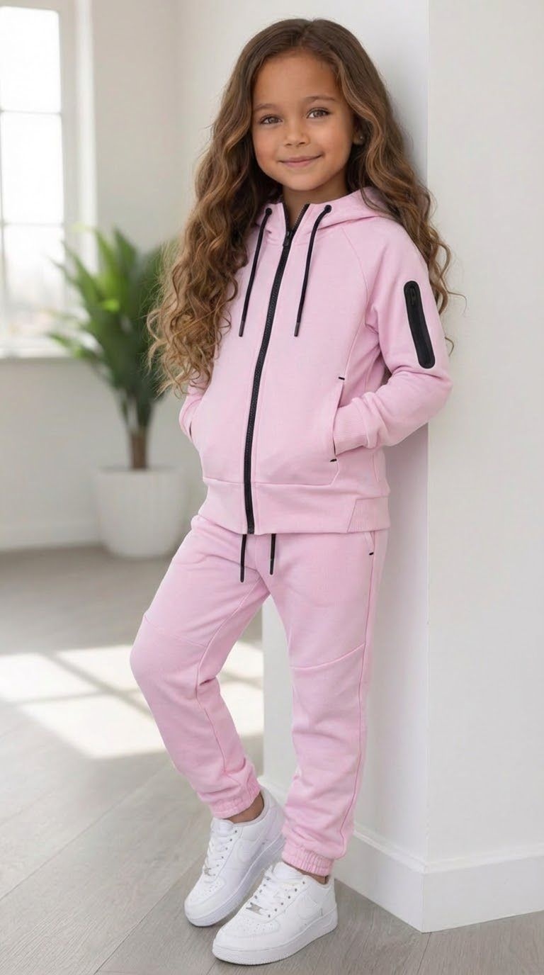 Dit trendy roze trainingspak is perfect voor meisjes die houden van comfort en een sportieve look. De set bestaat uit een hoodie met ritssluiting en capuchon en een bijpassende joggingbroek.