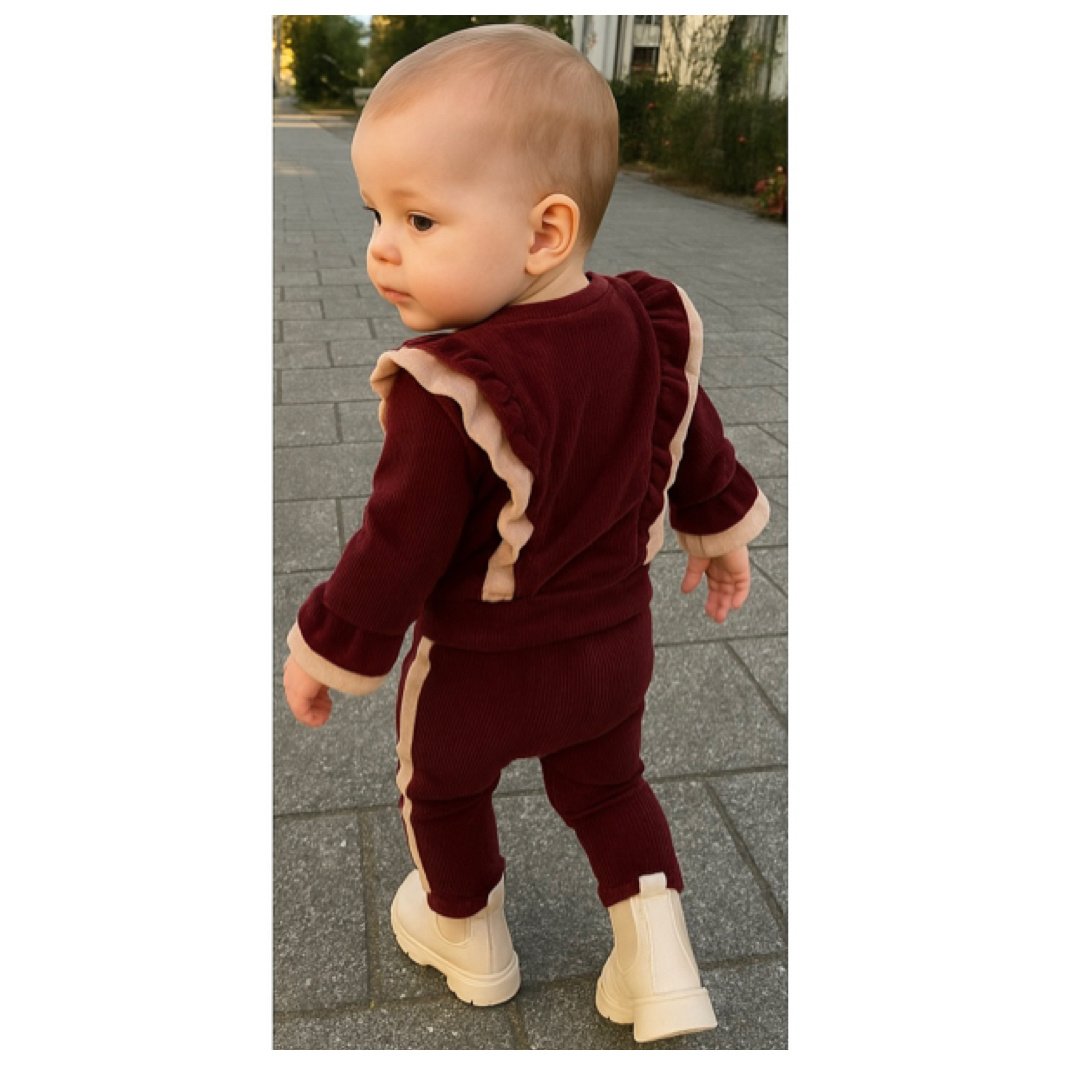 Trendy meisjes set in bordeaux ribstof met ruffles. Comfortabel en stijlvol voor elke dag. Op werkdagen vóór 15:00 besteld = morgen in huis.