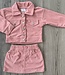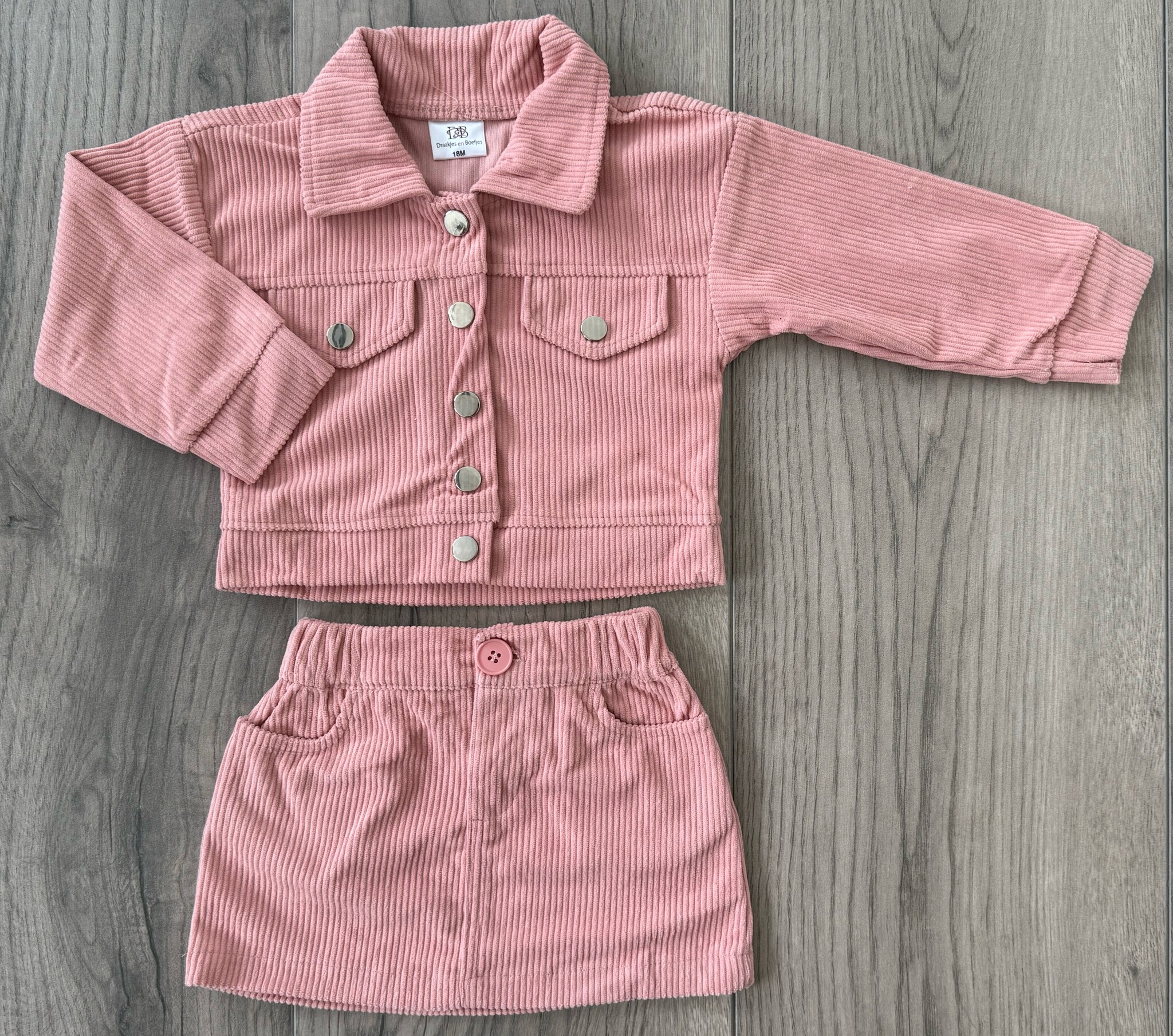 Ribstof setje voor meisjes in zachtroze: jasje met knopen en bijpassend rokje met zakjes. Verkrijgbaar in maat 80 t/m 128. Superleuk als outfit voor herfst of feestje!