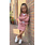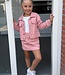 Dit schattige 2-delige setje van zachte ribstof bestaat uit een kort roze jasje met zilveren knopen én een bijpassend rokje met zakjes. Perfect voor de herfst/winter