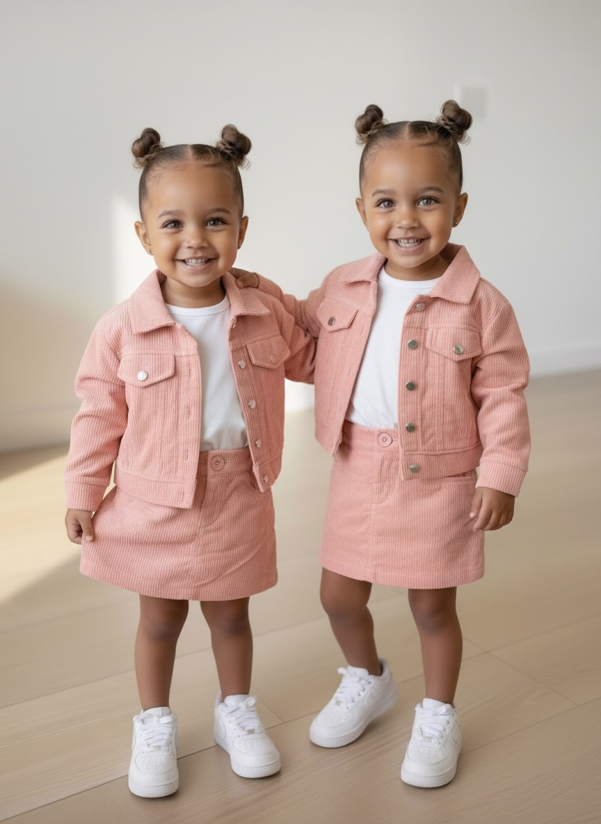 Ribstof setje voor meisjes in zachtroze: jasje met knopen en bijpassend rokje met zakjes. Verkrijgbaar in maat 80 t/m 128. Superleuk als outfit voor het voorjaar
