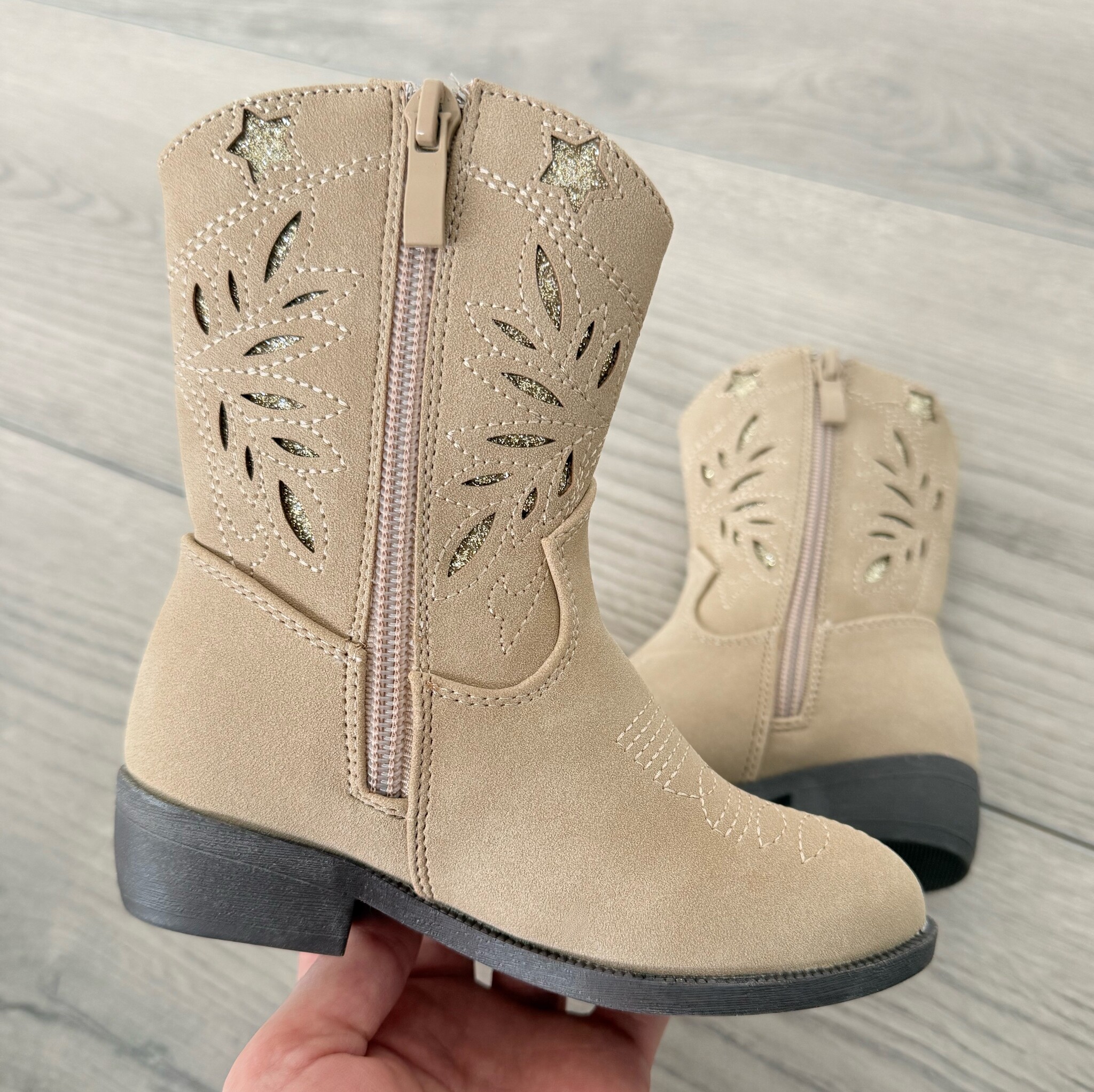 Beige cowboylaarsjes met glittersterren en bloemenmotief. Stoer én lief tegelijk! Met rits aan de zijkant en zachte voering. Verkrijgbaar in maat 25 t/m 36.