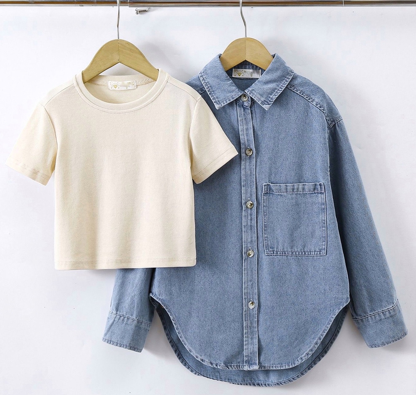 Deze trendy 2-delige meisjes set bestaat uit een stoere denim blouse en een basic beige top. Een perfecte combinatie van casual en stijlvol, ideaal voor modebewuste meiden.