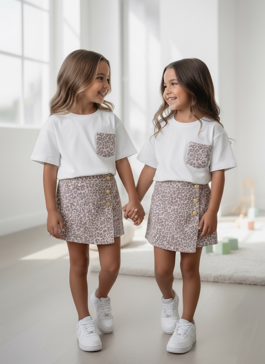 Denim Leopard skort Set - Wit (1 week levertijd)