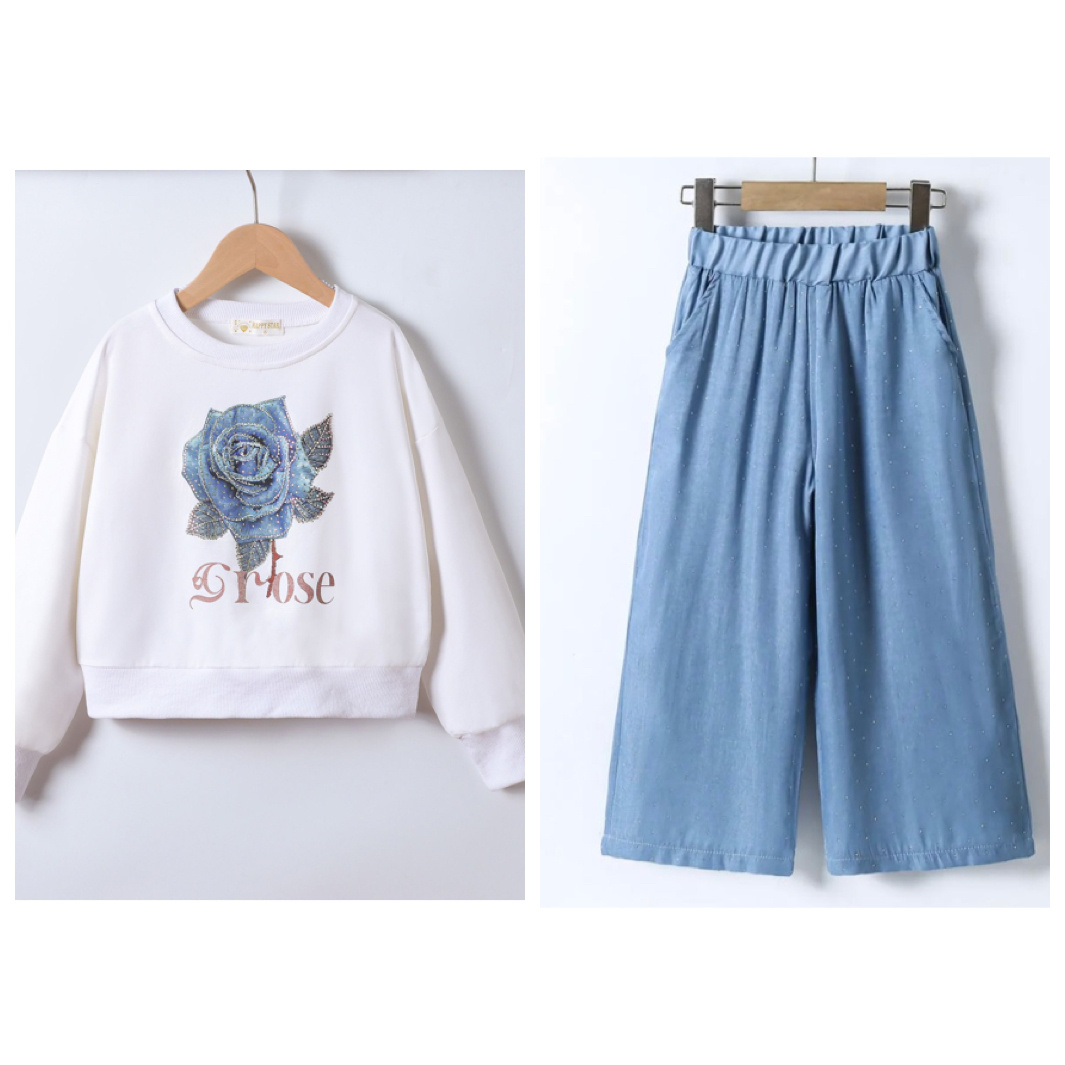 Een prachtig setje voor de meiden! Een 2-delig setje dat bestaat uit een wijde broek & een bijpassende trui met rozen print.