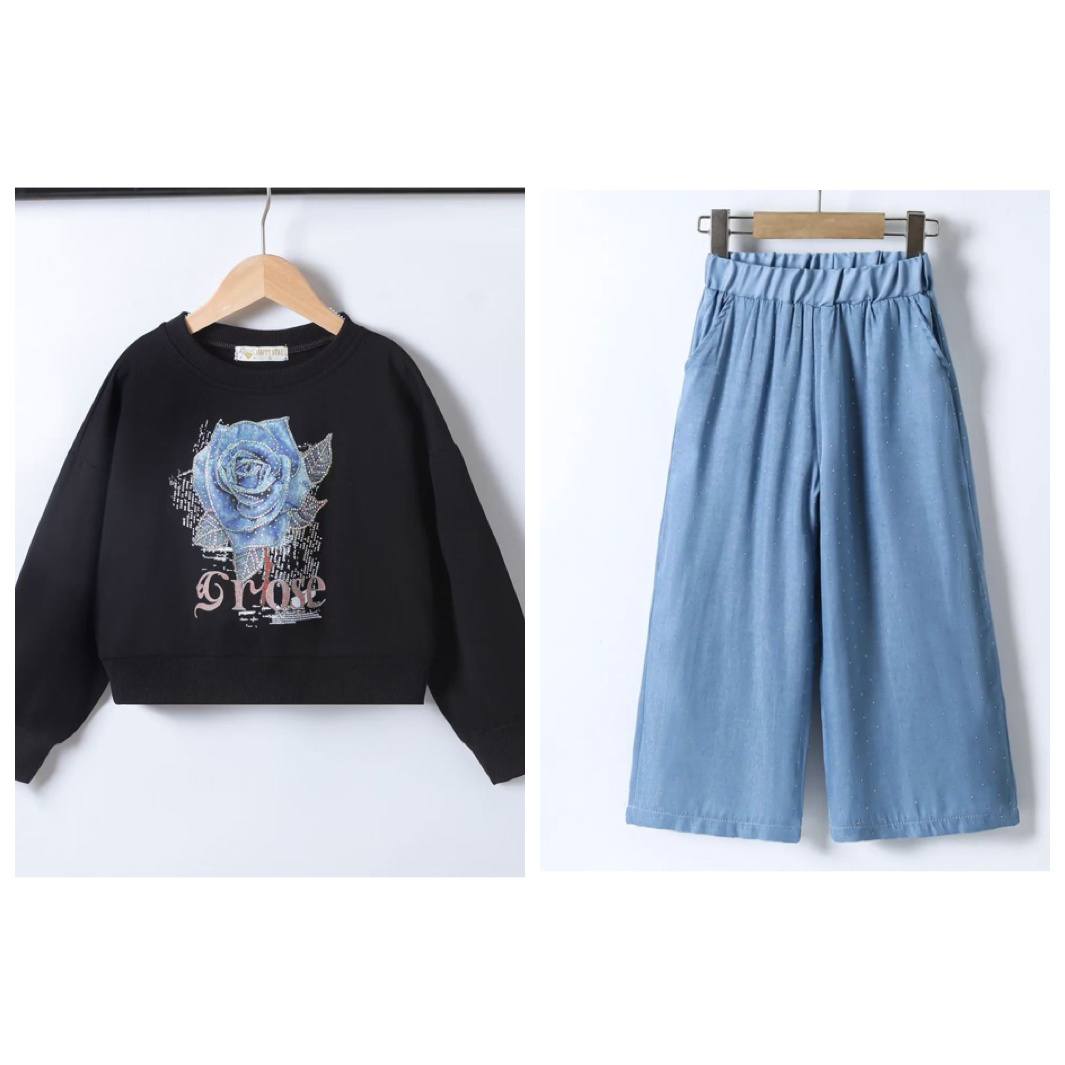 Een prachtig setje voor de meiden! Een 2-delig setje dat bestaat uit een wijde broek & een bijpassende trui met rozen print.