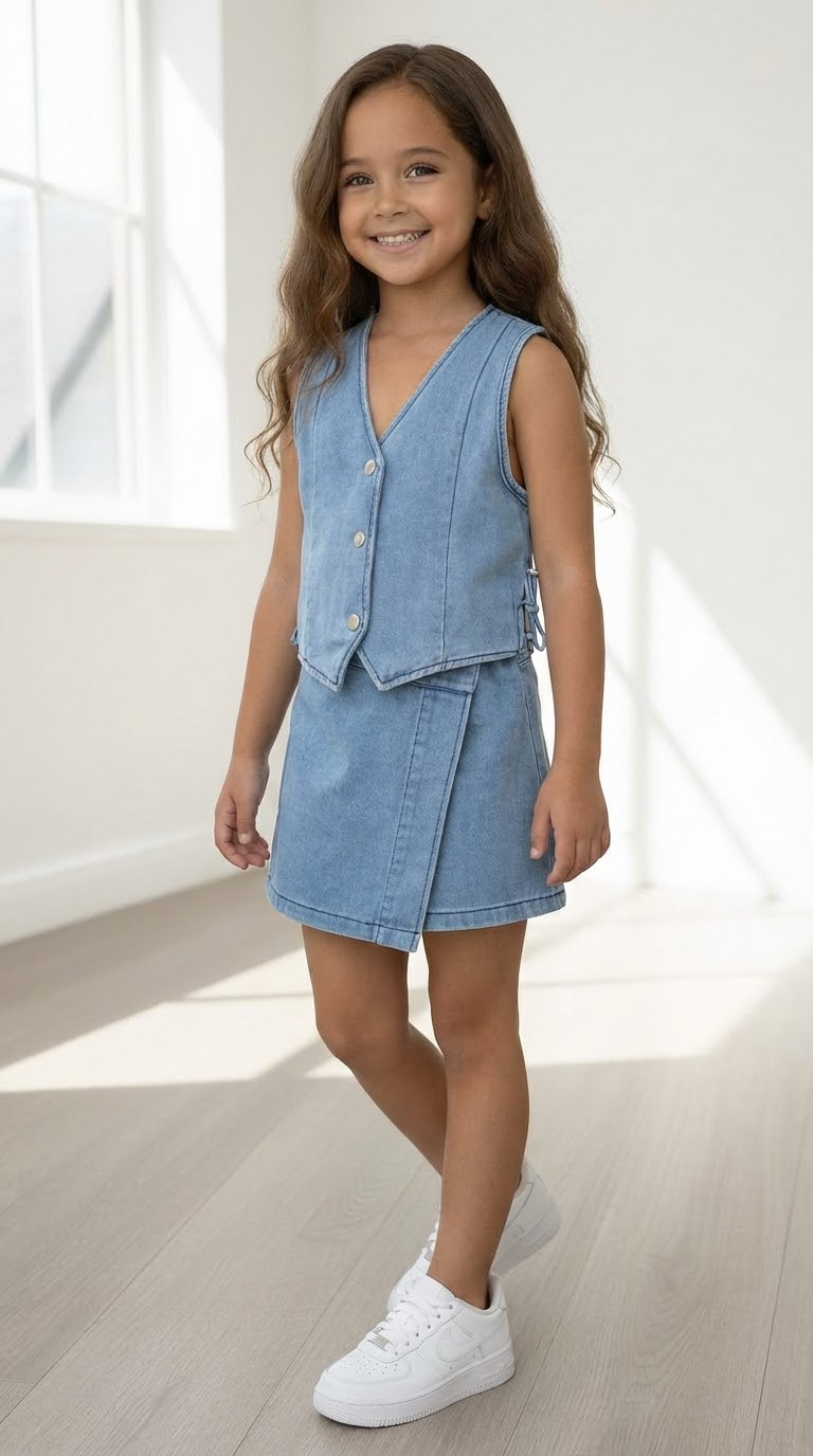 Dit super leuke 2-delige setje bestaat uit een denim rokje met denim jacket!