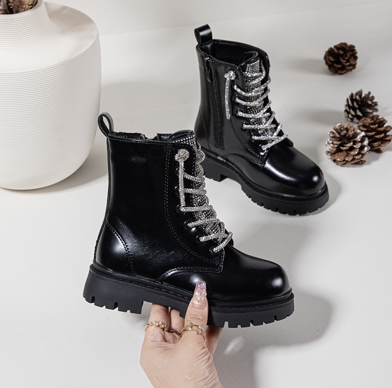 Trendy zwarte veterlaarsjes! Gevoerd van binnen voor warme voeten. Stoer & stijlvol, perfect voor winter en feestdagen. Maat 25 t/m 36.