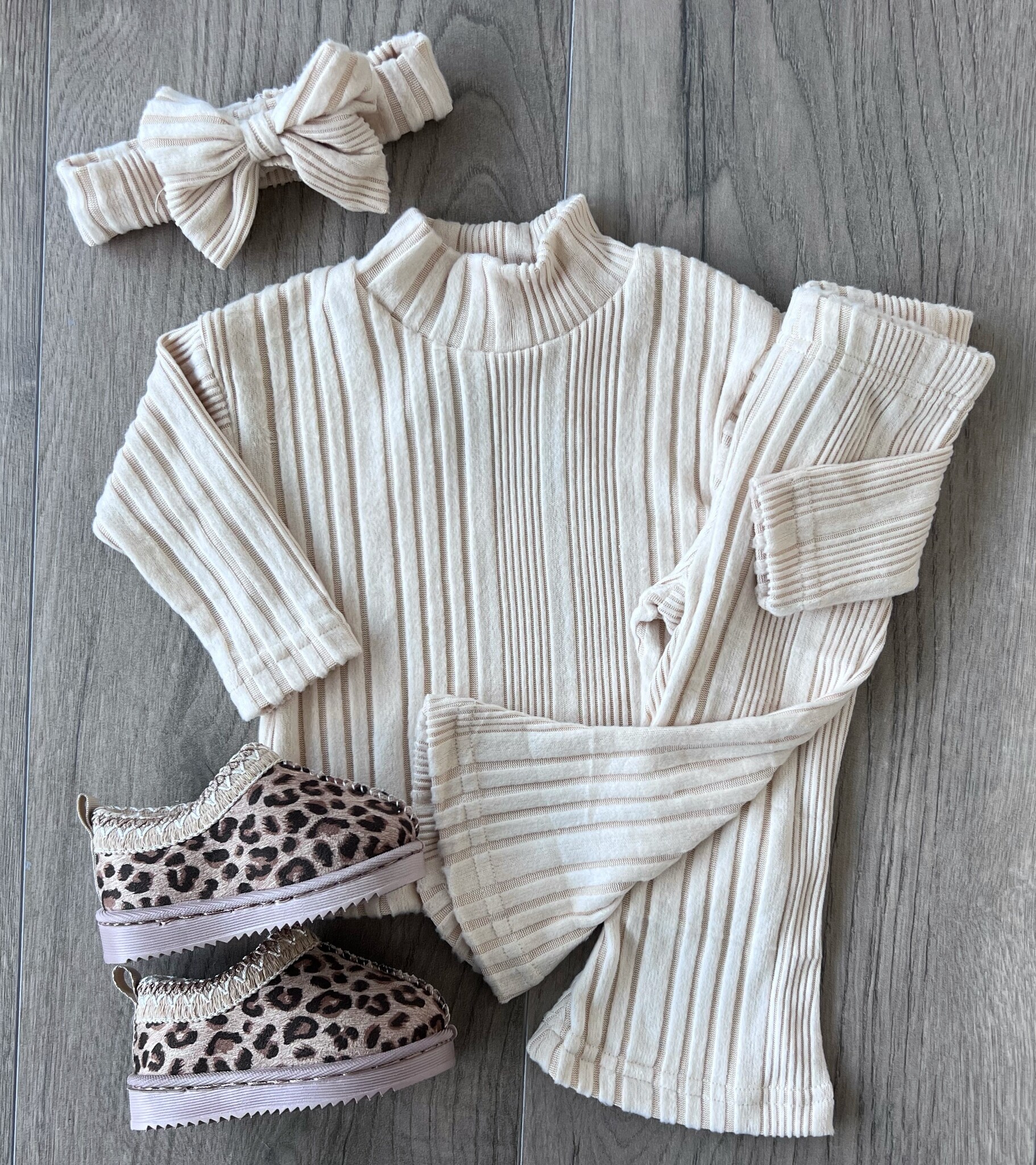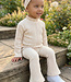 Zacht 3-delig setje in de kleur beige met een flares broek een bijpassend en een bijpassende haarband. Verkrijgbaar in de maten 56/62 t/m 98/104