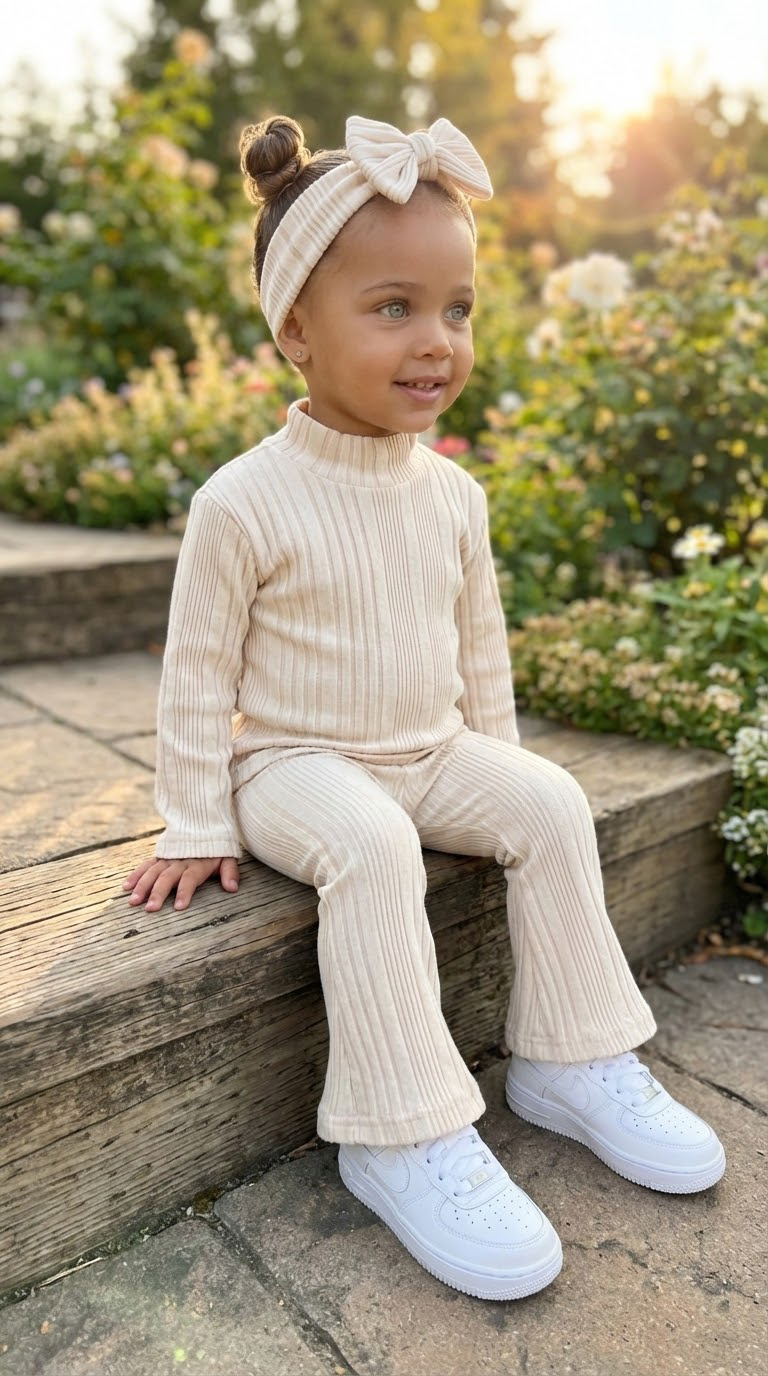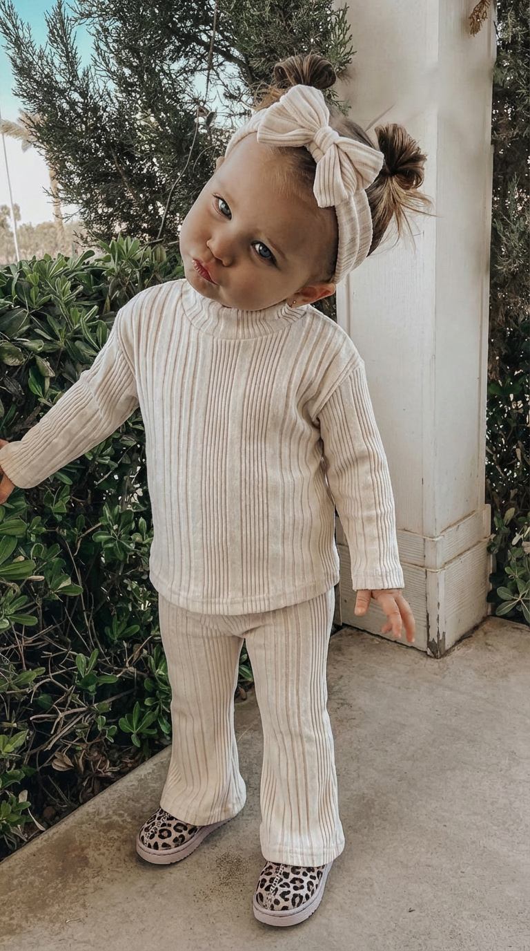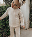 Dit beige ribsetje is een prachtig basic item voor jouw baby of peuter! De 3-delige set bestaat uit een ribgebreid longsleeve shirtje, een flared broekje en een bijpassende haarband met strik. Gemaakt van zachte, comfortabele ribstof die heerlijk draagt en een stijlvolle uitstraling geeft.