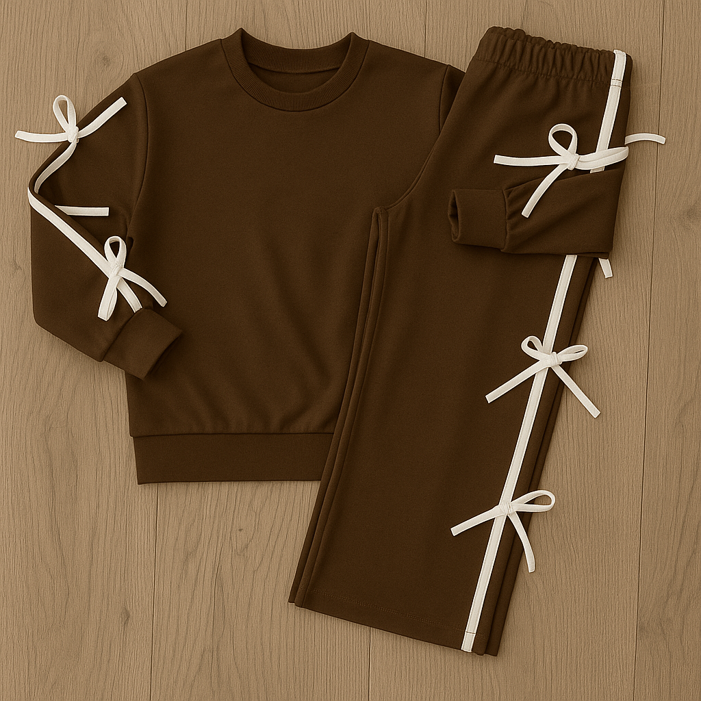 Camel meisjes setje met witte strikken op mouw en broekspijp. Gemaakt van stretchstof voor een comfy fit. Verkrijgbaar van maat 98/104 t/m 158/164. Super trendy én lief!
