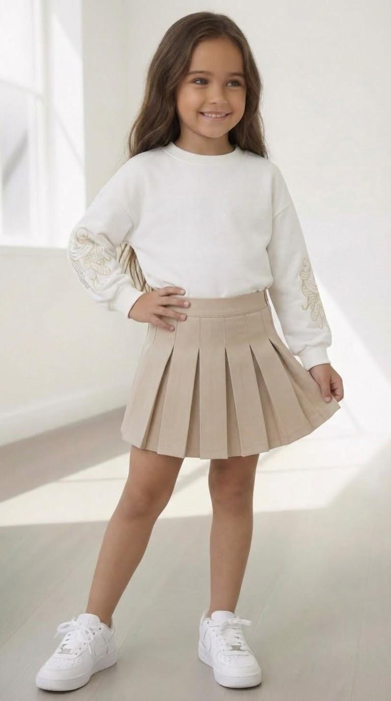 Stijlvolle meisjes set bestaande uit een zachte sweater en een beige plissé rok. Comfortabel, trendy en perfect voor elke gelegenheid. Verkrijgbaar in maat 98/104 t/m 158/164.
