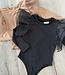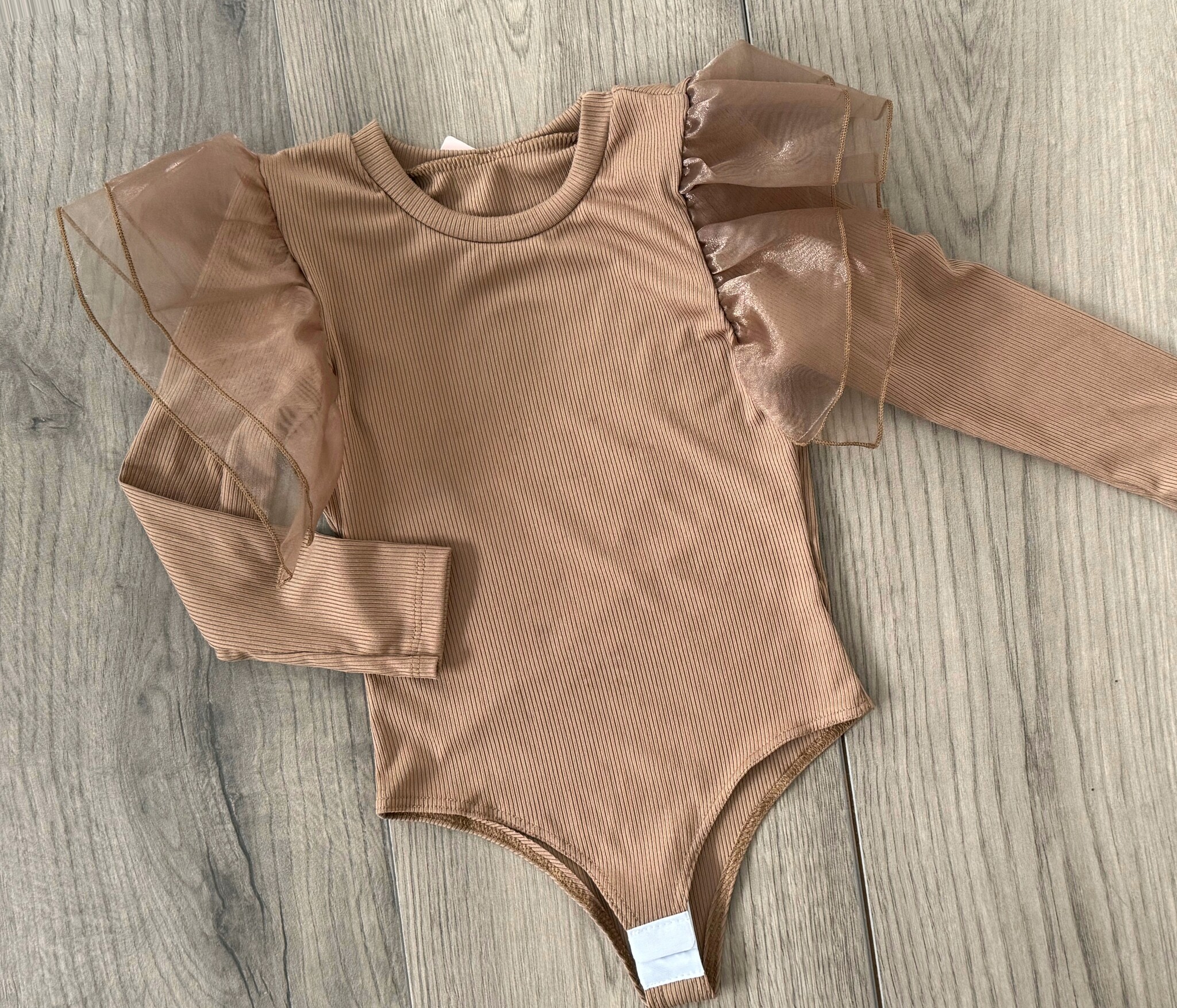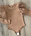 Trendy beige bodystocking met ruffle kraag. Comfortabel en stijlvol, ideaal te combineren met rokjes of broeken. Verkrijgbaar van maat 80/86 t/m 122/128.