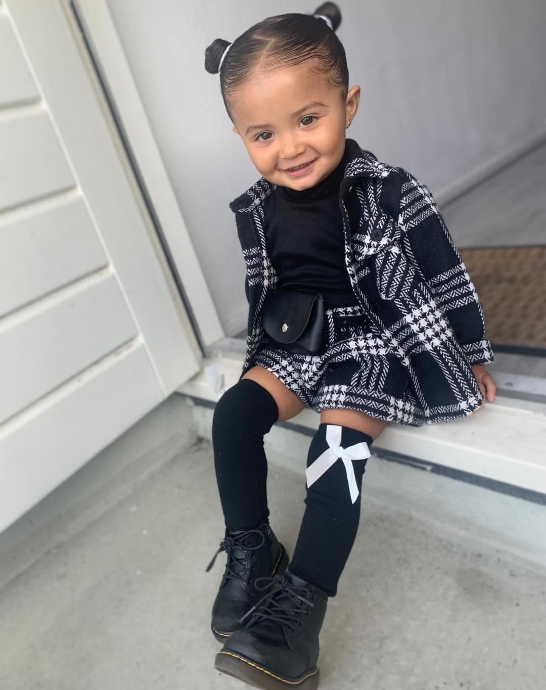 Stijlvol 5-delig zwart-wit setje met jasje, broekje, top, heuptasje & kniekousen. Een echte eyecatcher voor jouw meisje!