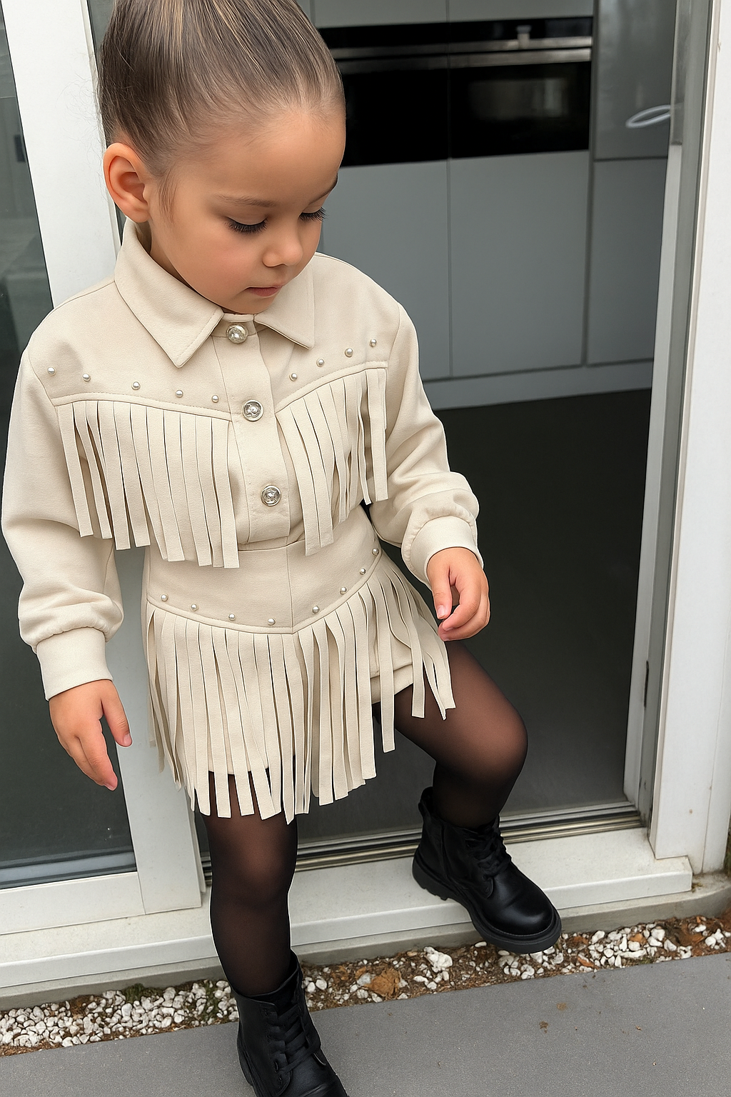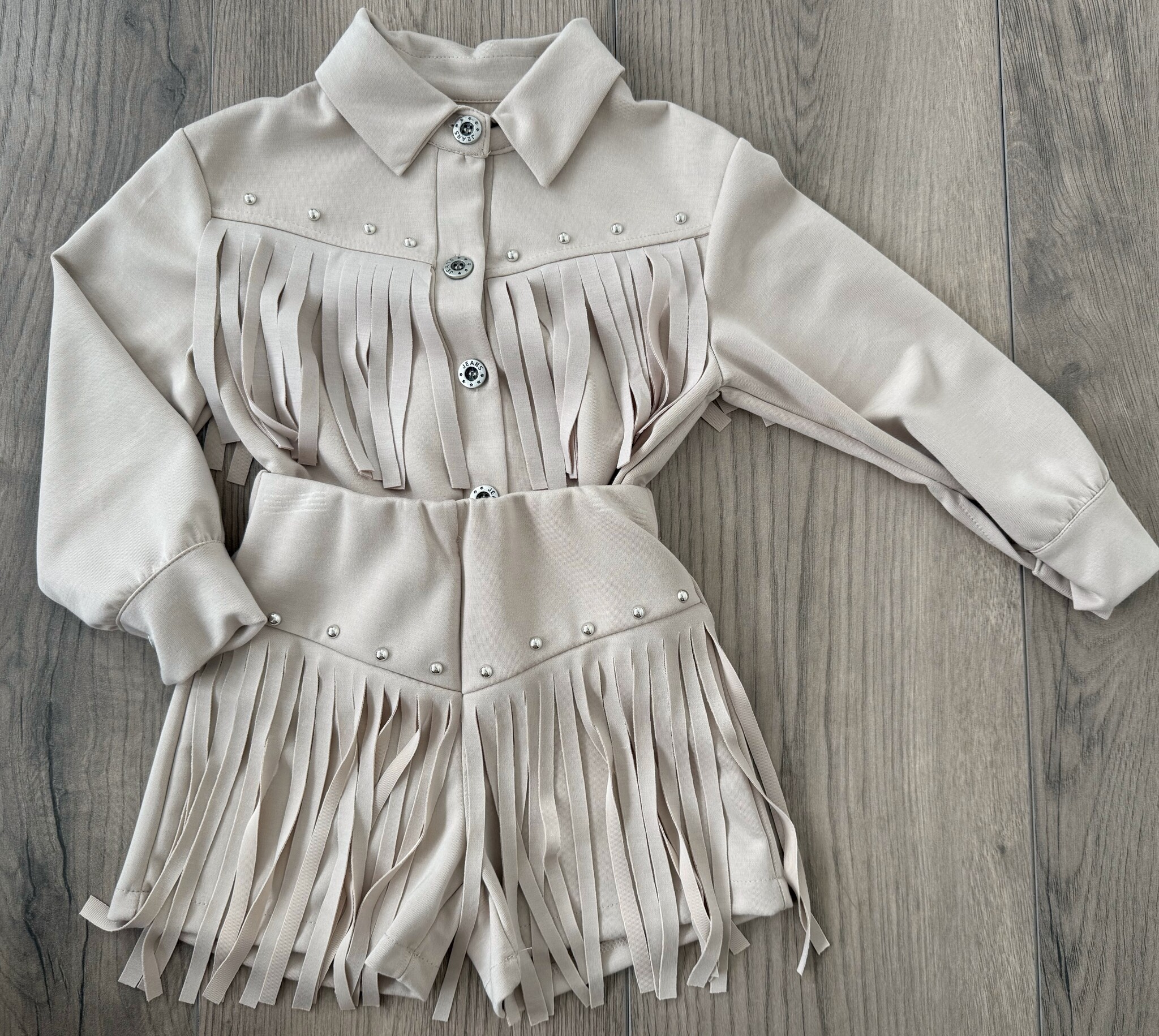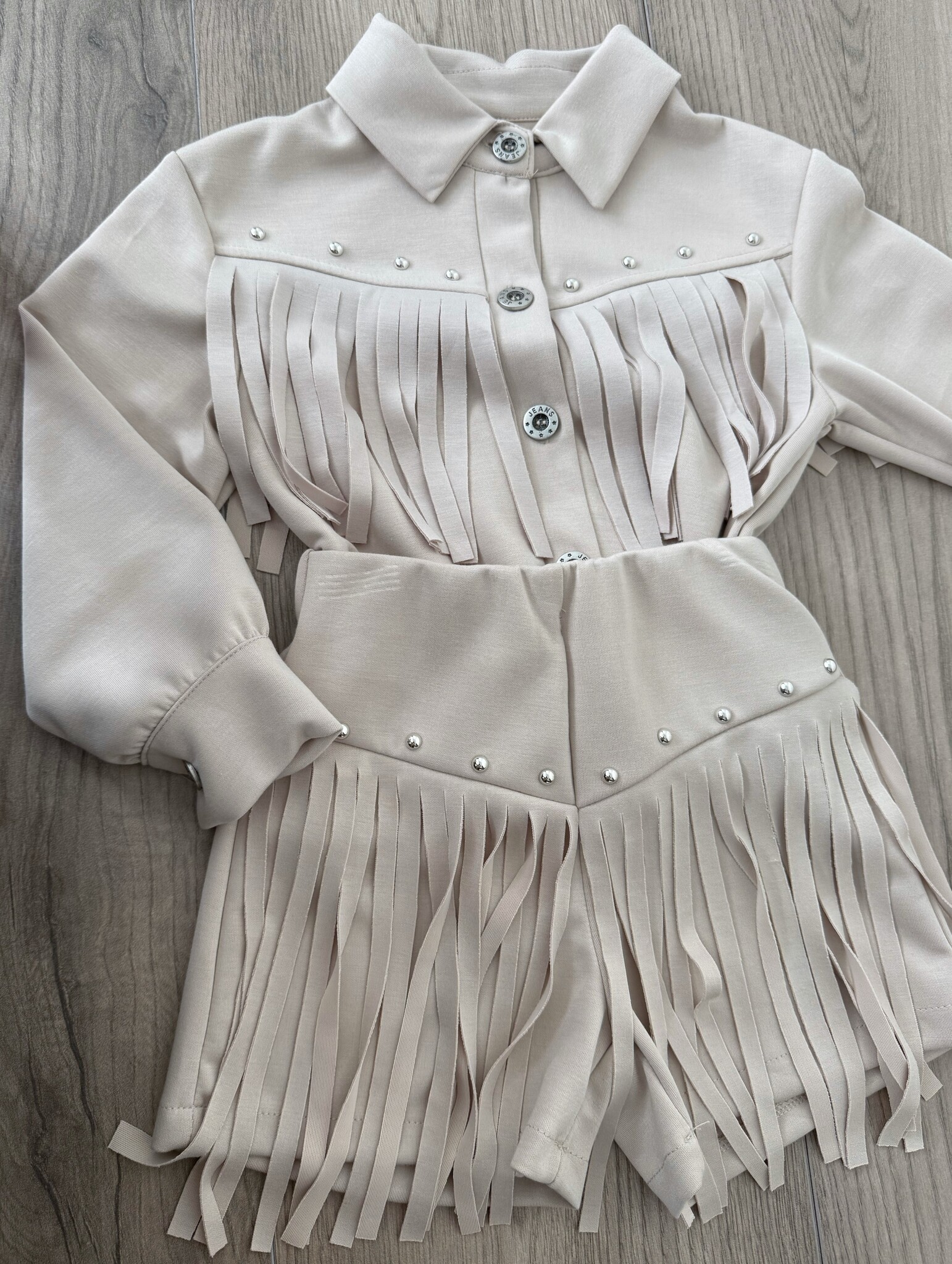 Deze beige fringe set met pareldetails is een echte eyecatcher. De zachte stof, elegante franjes en glanzende knoopjes zorgen voor een luxe uitstraling.