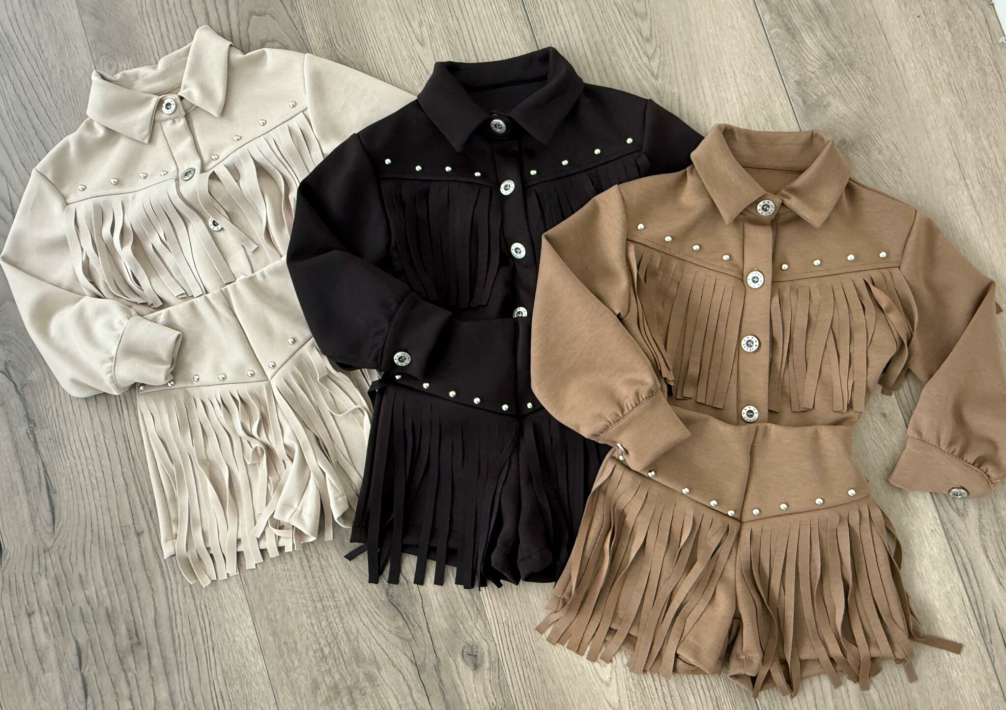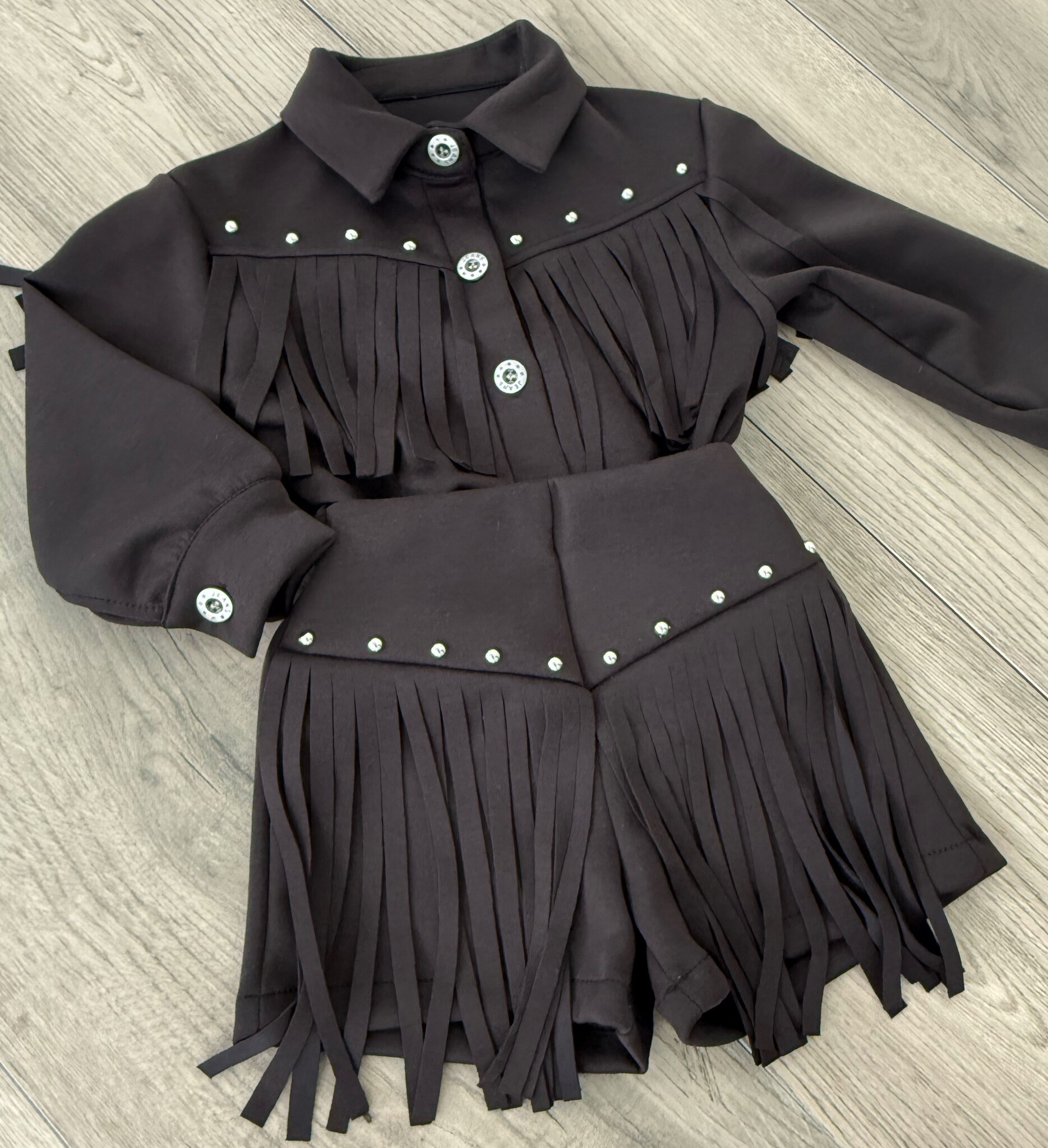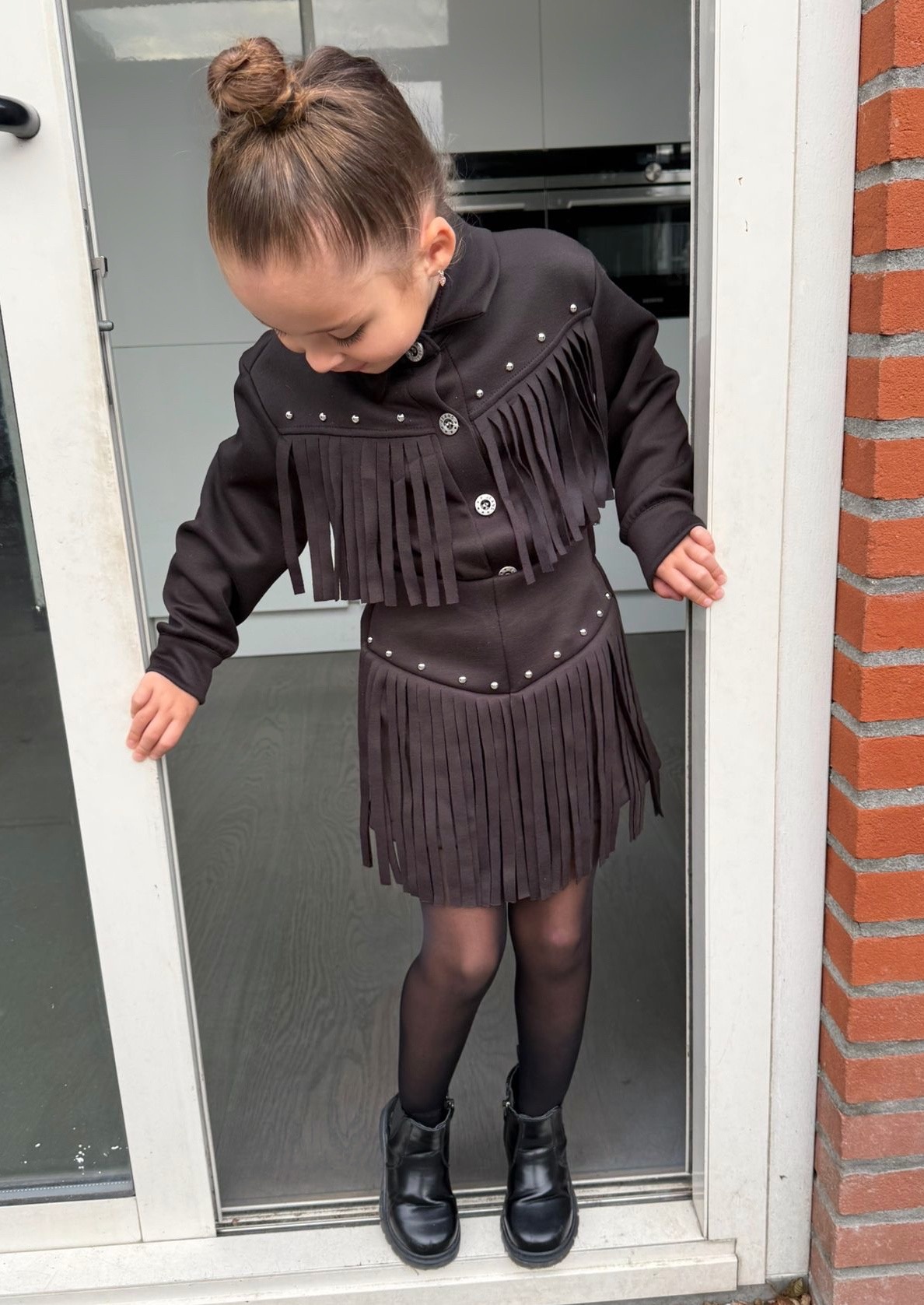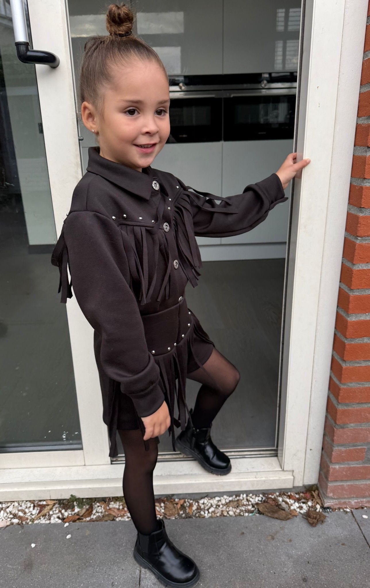 Zwart fringe setje met pareldetails! Luxe en speels tegelijk met franjes, parelknopen en een comfortabele pasvorm. Verkrijgbaar in maat 98/104 t/m 158/164.