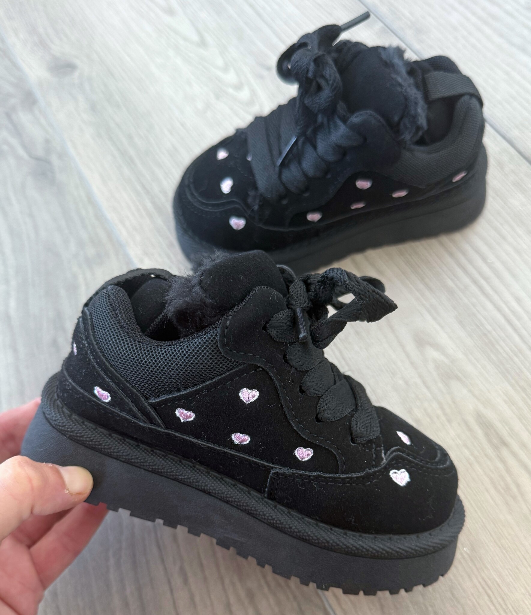 Trendy zwarte sneakers met zachte bontvoering. Warme kinderschoenen, ideaal voor de winter. Verkrijgbaar van maat 21 t/m 36.
