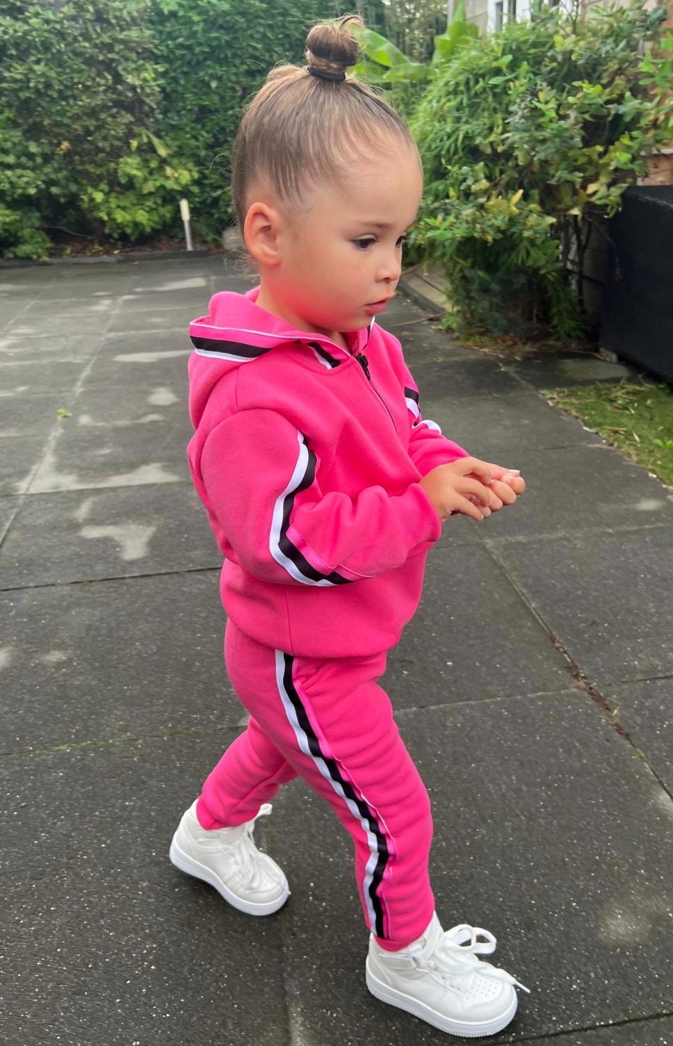 Dit felroze meisjes joggingpak is een musthave voor kleine fashionista’s die houden van comfort én stijl. Het pak bestaat uit een hoodie met rits en een bijpassende jogger, beide voorzien van een sportieve streep in zwart-wit langs de mouwen en broekspijpen.