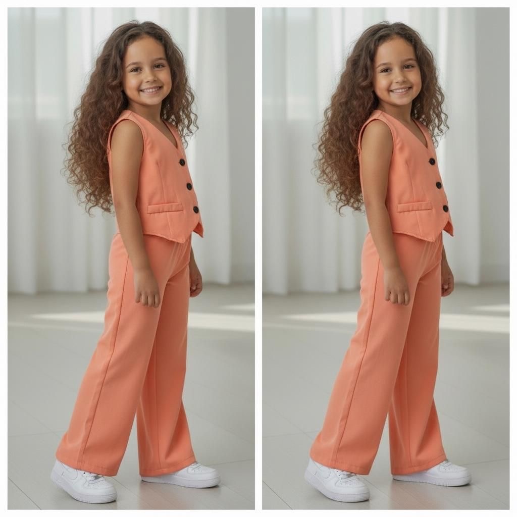 Coral meisjes gilet setje met wijde broekspijp. Gemaakt van neutrale stof voor een comfy fit. Verkrijgbaar van maat 98/104 t/m 158/164.